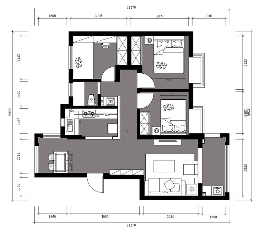 此戶型,前期在廚房和現(xiàn)在的餐廳位是否做一個調(diào)整,在和客戶再三溝通中,決定保留原始戶型,餐廳位相對狹長,后期從地面和頂面來處理,緩解餐廳狹長的問題,整體空間以高級灰為主,搭配淺色家具,讓整個空間形成深與淺的跳躍,后期空間的靈動性更強