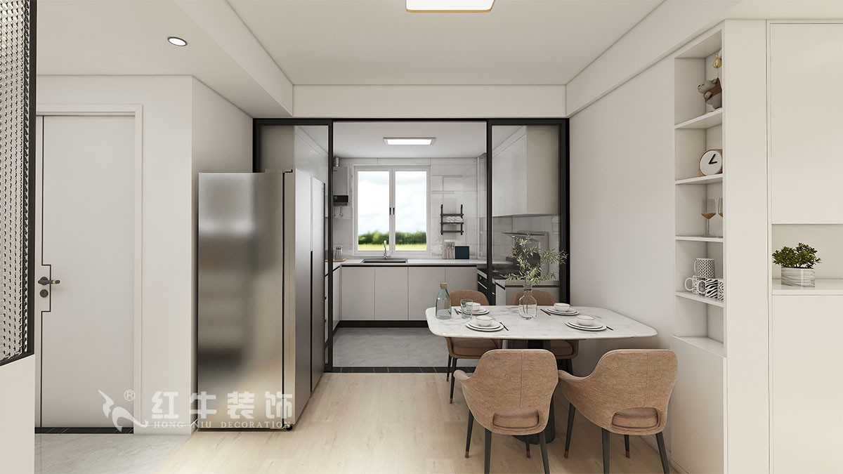 本案設(shè)計(jì)老人居住,通過改造優(yōu)化過道空間,增加鞋柜儲(chǔ)物,同時(shí)增加次臥空間,也使餐廳空間得以放置。干區(qū)通過雙面玻璃形式,增加采光,矮墻的設(shè)計(jì),不增加衛(wèi)生死角。整體白色,加以木色點(diǎn)綴,使空間更加明亮、自然。原木色的地板,給人溫馨、安逸的感覺。