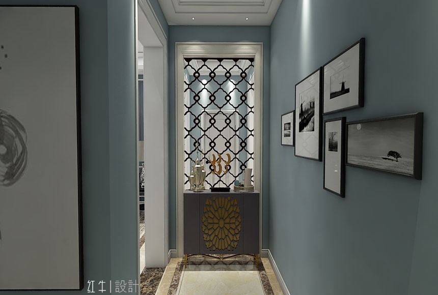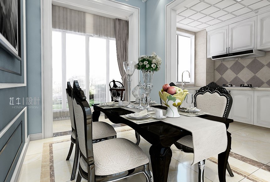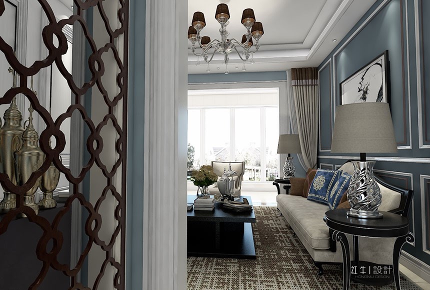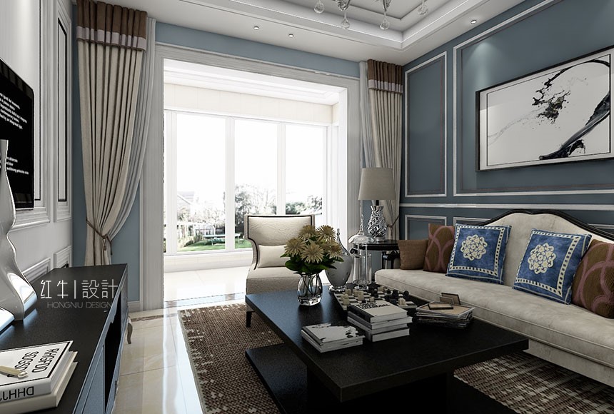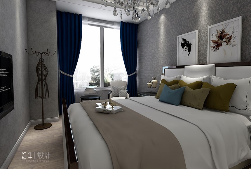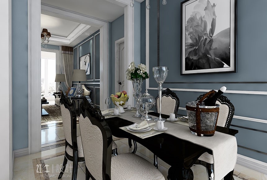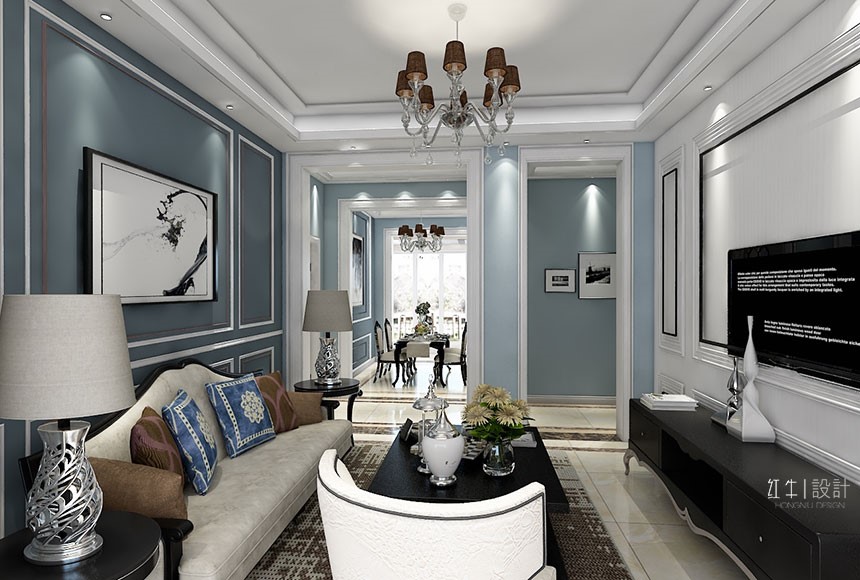 此戶型考慮現(xiàn)代簡(jiǎn)歐風(fēng)格,主體顏色以藍(lán)色為主,搭配深淺家具,表