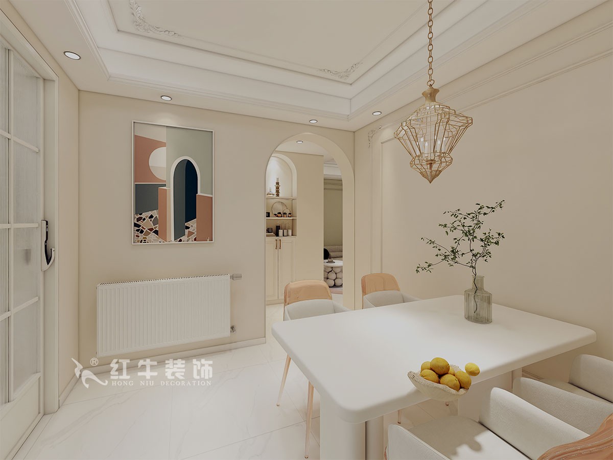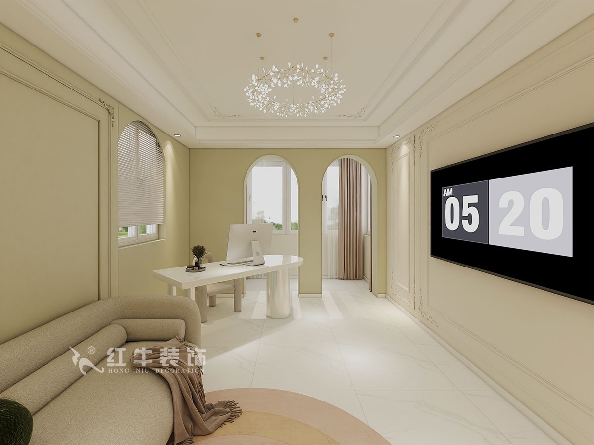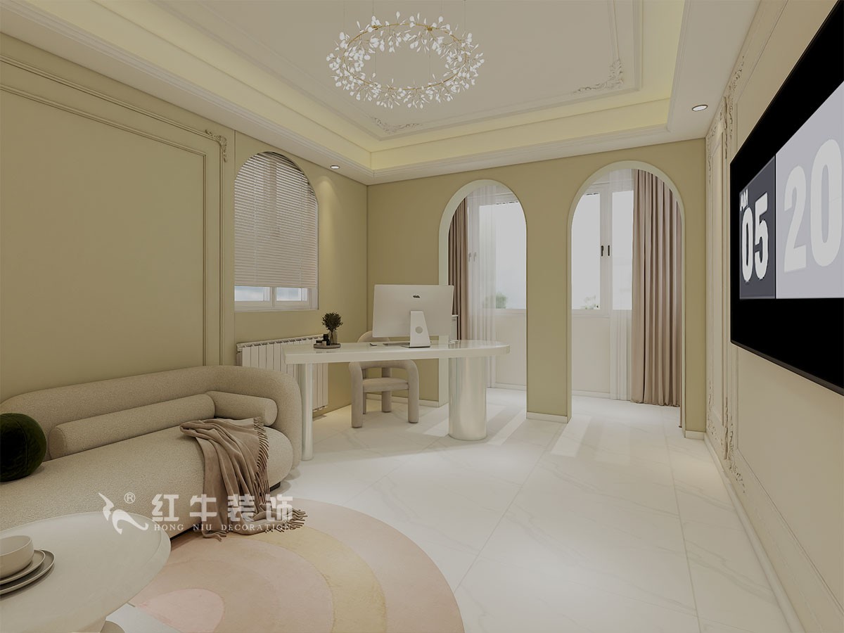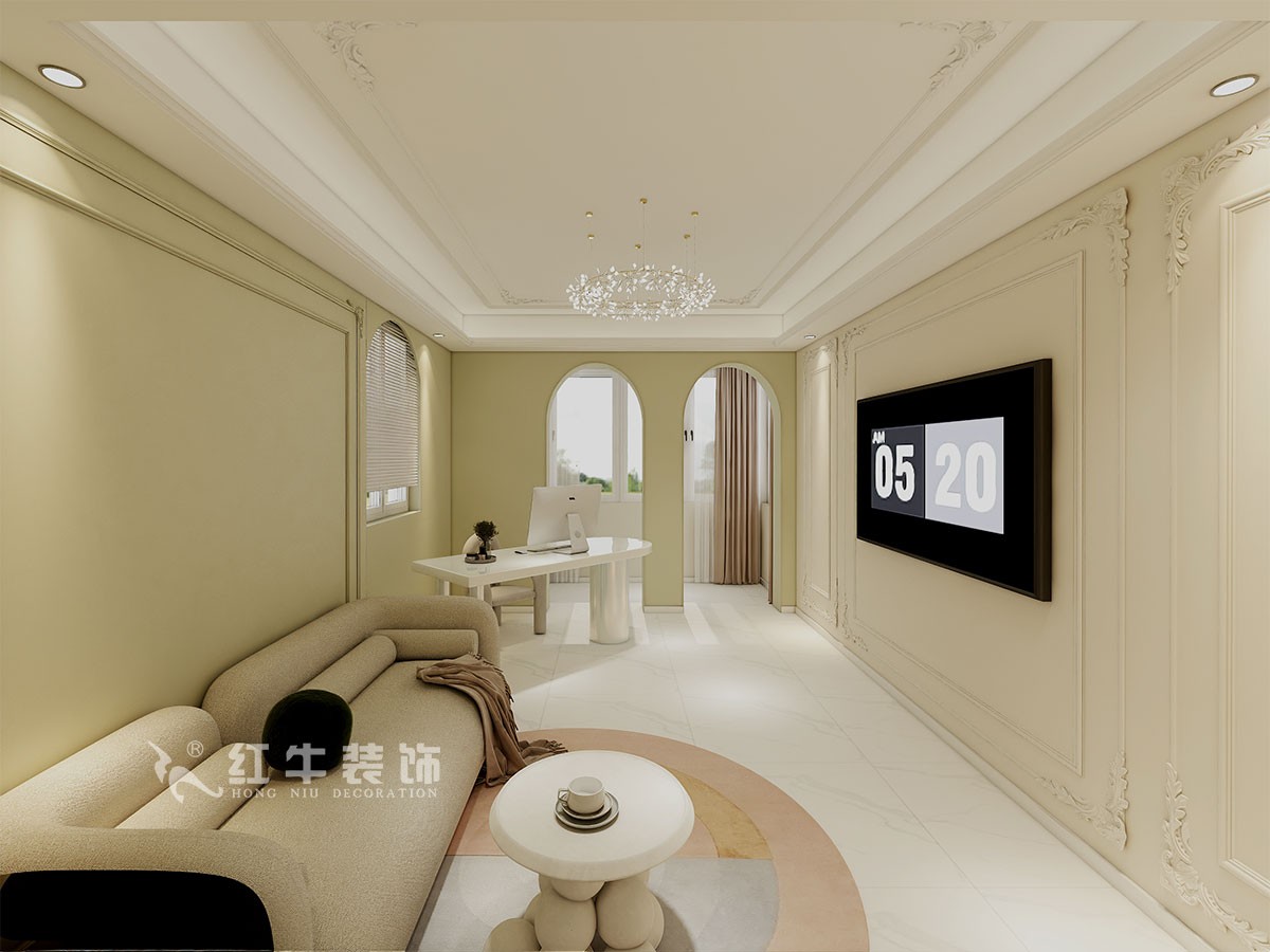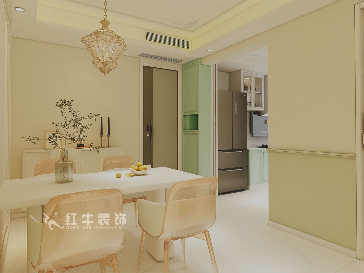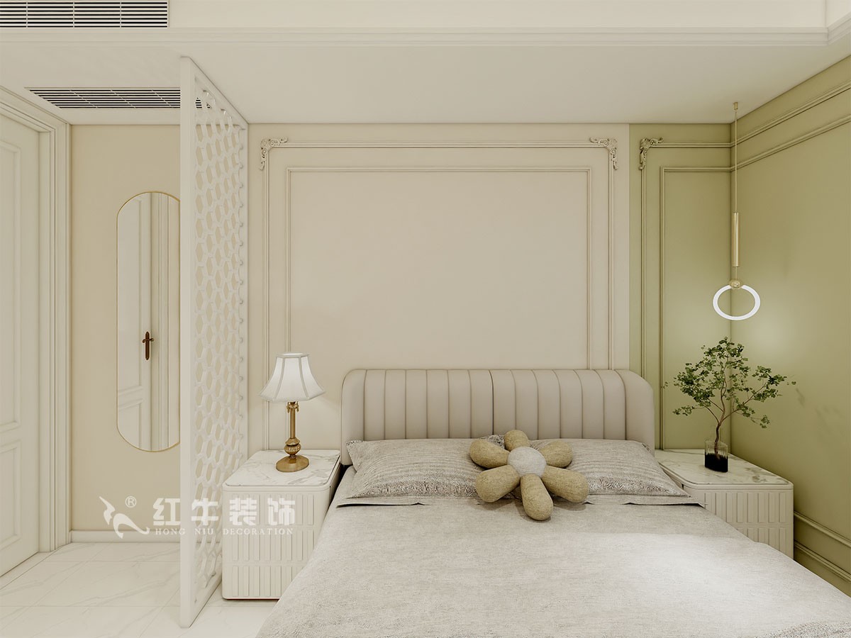 本案是本案客戶女兒回國臨時居住,以法式奶油風定義,網(wǎng)紅牛油果綠加上汝窯色,調(diào)節(jié)出歡快溫馨的效果,頂墻面線條增加立體層次感,設(shè)計上背景采用牛油果綠加上暖色的搭配,使空間看起來溫馨自然,利用原結(jié)構(gòu)的特點制作出三個圓弧,交相呼應。