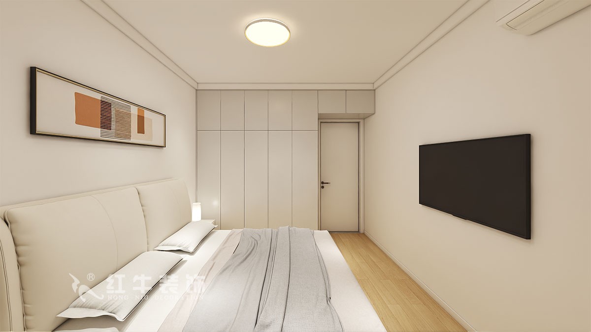 臥室單眼皮吊頂設計使空間更加不壓抑,白灰色色色大床更適合兩人的居住需求和觀感,和奶茶色的柜子相得益渣。整個空間色調溫和的,很適合臥室的氛圍感。