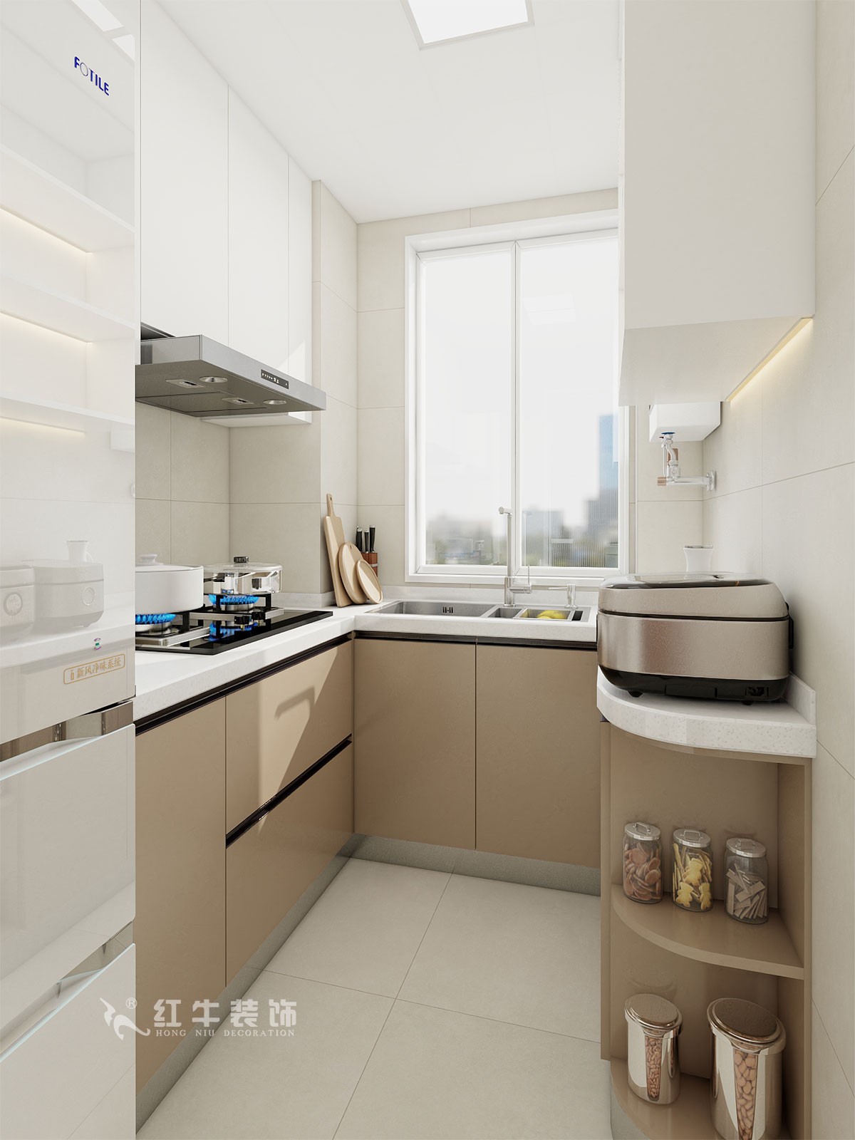此戶型南北通透,在戶型改造上面并沒有太大的必要,于是我們站在客戶的角度為客戶著想,將廚房的房門朝向進(jìn)行了改動(dòng),讓房間更加方便的同時(shí)使得居住的舒適度也有所提升。