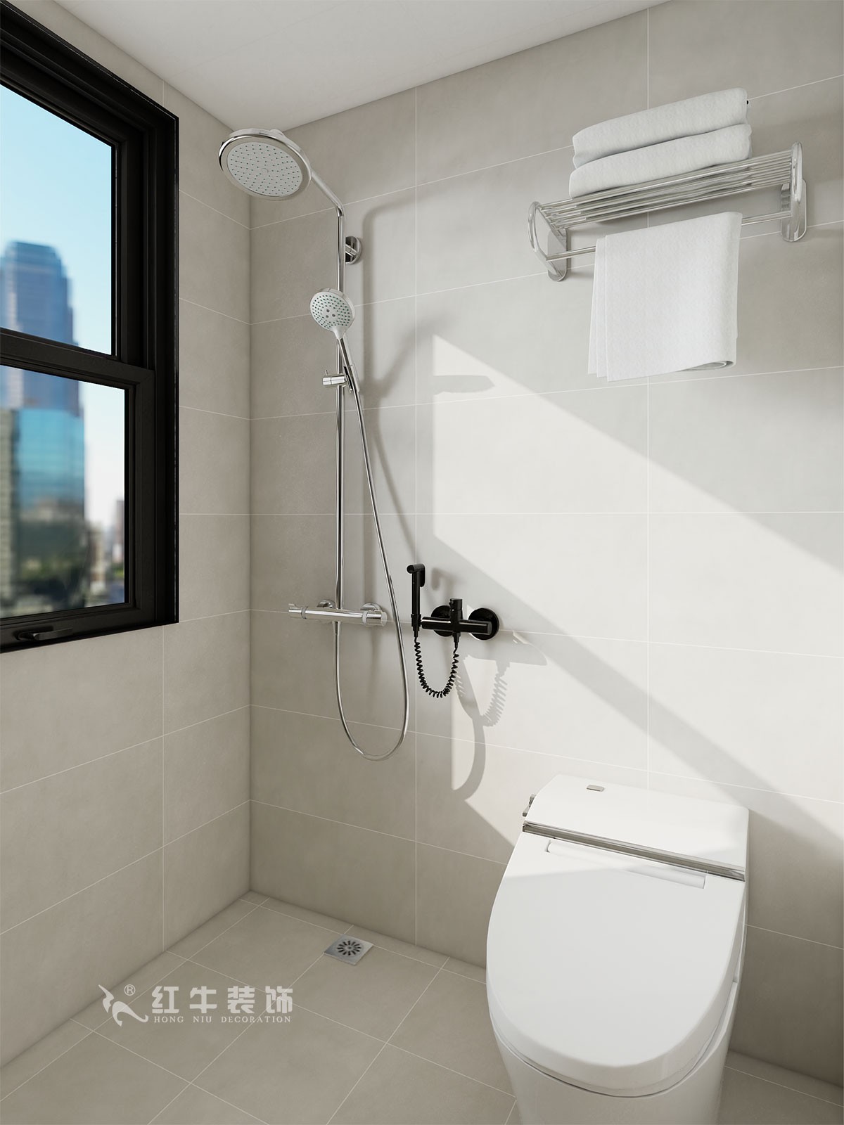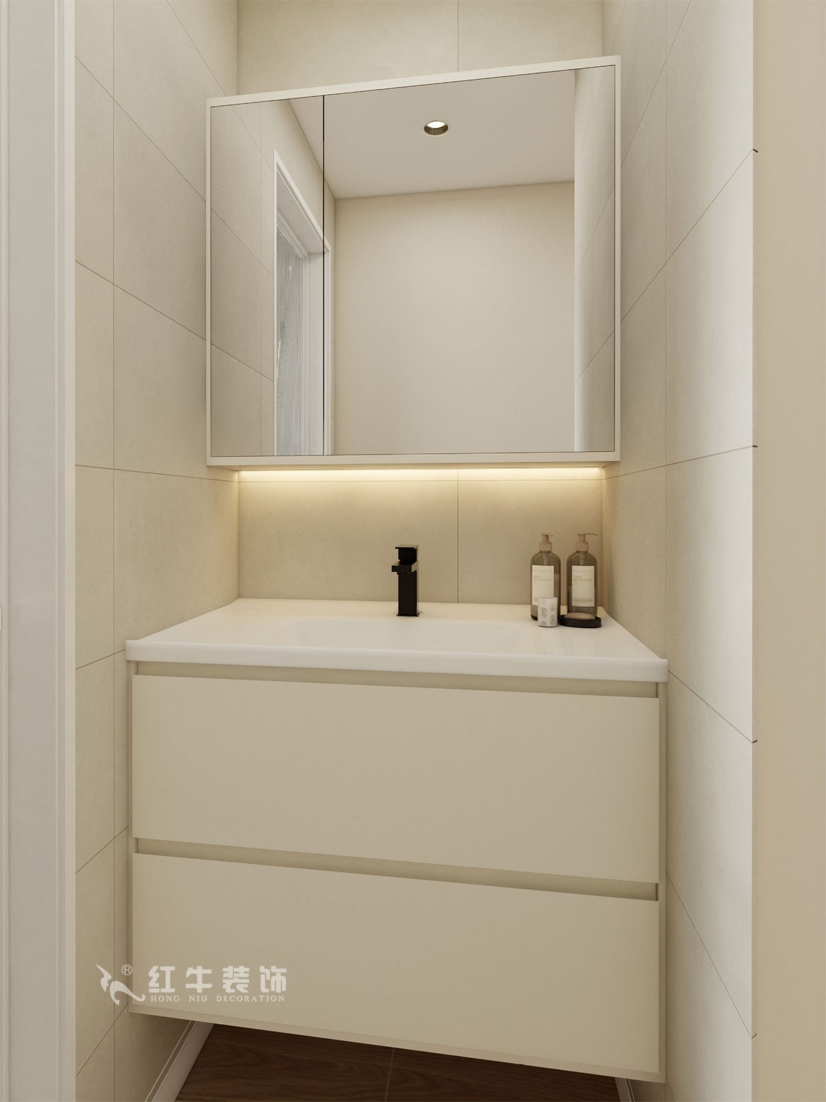 衛(wèi)生間說(shuō)明:干區(qū)選擇整體色彩搭配干凈、大方,墻面設(shè)計(jì)選擇大尺寸瓷磚上墻,高級(jí)感滿滿。