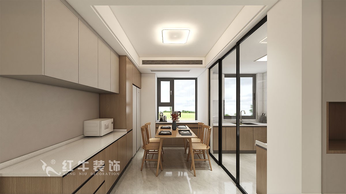 本案客戶一家一代人居住,小孩偶爾過來,大體結(jié)構(gòu)不需要那么多房間,將靠近廚房一側(cè)的房間打通,改為餐廳,奶白色的墻體顏色,搭配原木色的柜子和餐桌椅,灰色的地磚,使得空間溫暖自然。巨大的儲(chǔ)物柜,滿足居家使用,臥室雙眼皮吊頂設(shè)計(jì)使空間更加不壓抑,原木的床具滿足居住需求和觀感,和灰色的柜子相得益彰。整個(gè)空間色調(diào)溫和,很適合臥室的氛圍感。