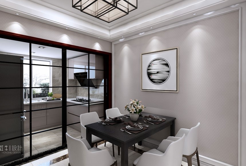 餐廳與廚房之間使用玻璃進(jìn)行隔斷,使得空間通透,采光良好。餐廳這小小空間里,隨處可見的線條元素,打造出簡潔明快的視覺效果。