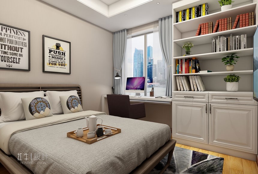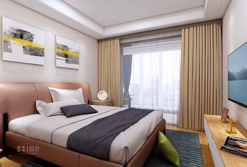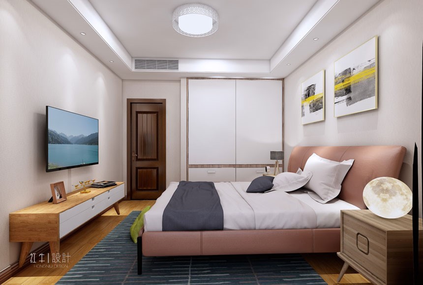 臥室中的床,電視柜,床邊柜都是底部留空,既能滿足收納的要求,顏值也頗高,并且懸空的底部方便清潔。