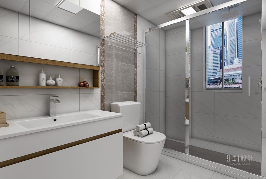 主臥還配備了衛(wèi)生間,整體來看非常簡潔,但從設(shè)計來看,卻是實用又美觀,比如洗手臺上安裝的鏡柜,既可用于儲物,又可用做大鏡子,使浴室顯得明亮又寬敞。