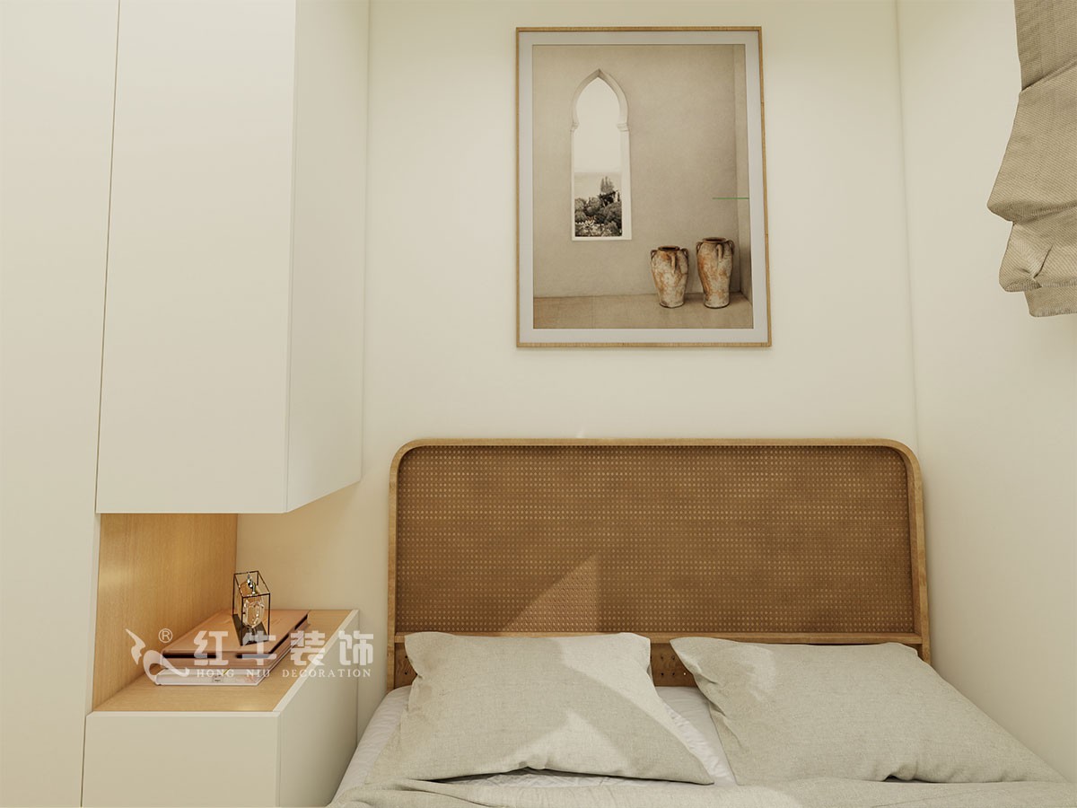 臥室說明:搭配大面積的白色定制衣柜,床頭的光源以不同形勢(shì)呈現(xiàn),及滿足不同燈光需求,又恰到好處地起到了裝飾效果,使整體臥室空間呈現(xiàn)明亮、溫柔的舒適狀態(tài)。