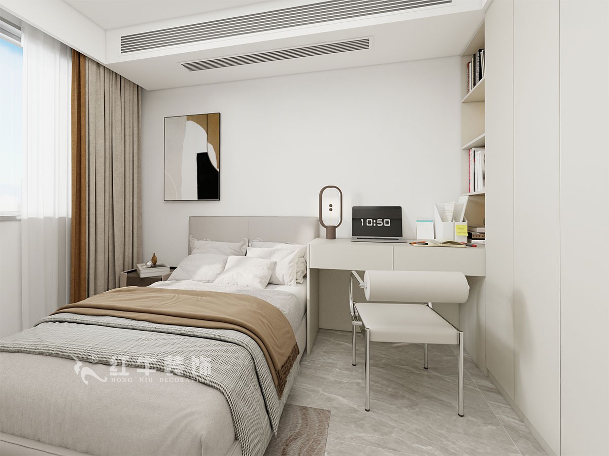 房型基本規(guī)整,廚房面積偏小,需要解決冰箱的擺放問題。過道狹長,方案擴(kuò)大了廚房的空間,衛(wèi)生間做了干濕分離,使得北臥和書房面積擴(kuò)大,次臥也重新做了功能分區(qū),使得整體空間規(guī)劃更合理。