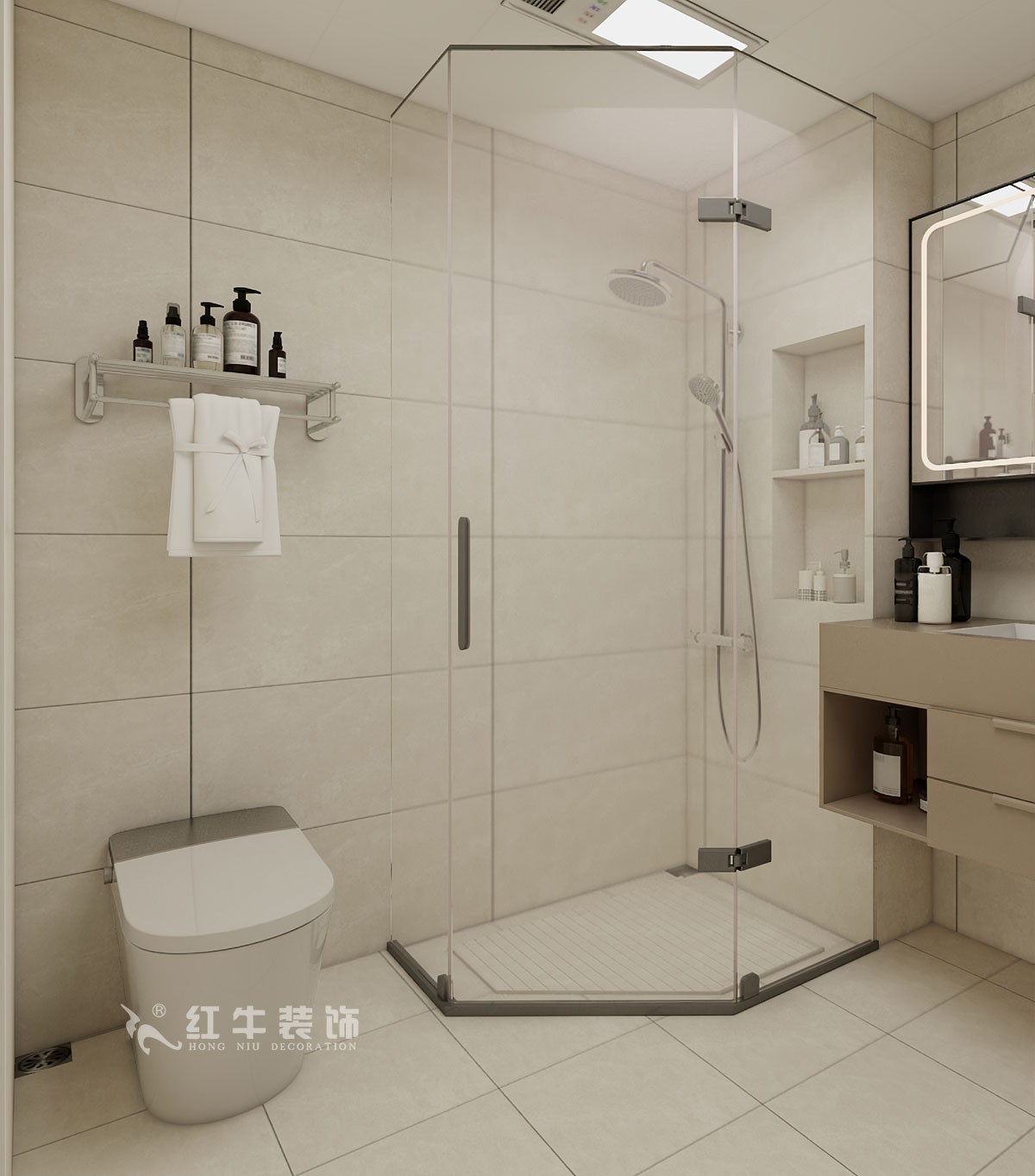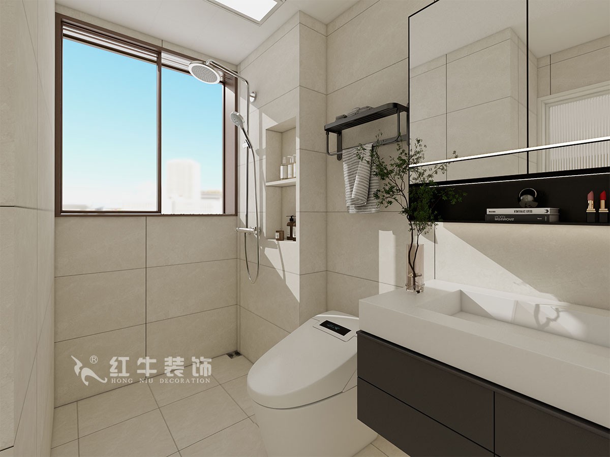 衛(wèi)生間說(shuō)明:干區(qū)選擇整體色彩搭配干凈、大方,選擇大尺寸米色瓷磚上墻,氛圍感溫馨感滿滿。