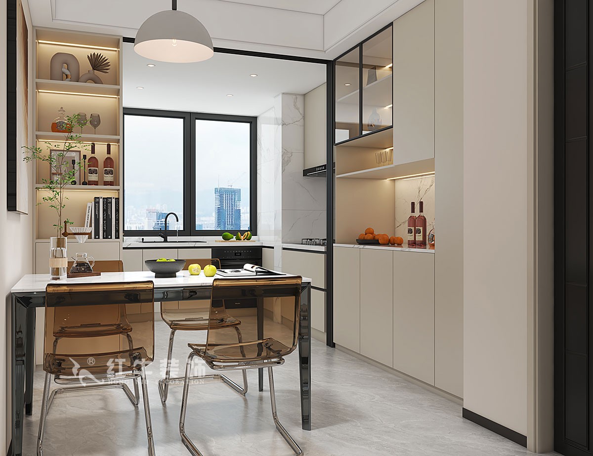客餐廳空間很規(guī)整,通過細節(jié)的處理打造輕松舒適的現(xiàn)代風居家環(huán)境。