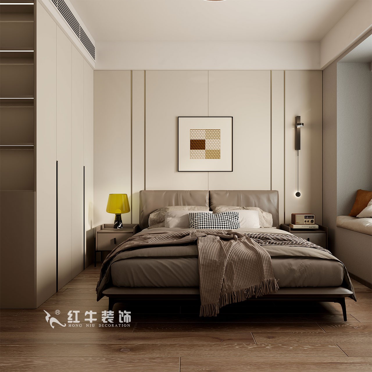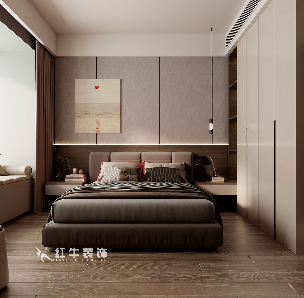 主臥無主燈設(shè)計,搭配床頭燈帶與吊燈,多光源滿足不同需求。延續(xù)整體空間的色調(diào),低飽和度色系搭配木地板,營造溫馨舒適、優(yōu)雅的睡眠空間。
