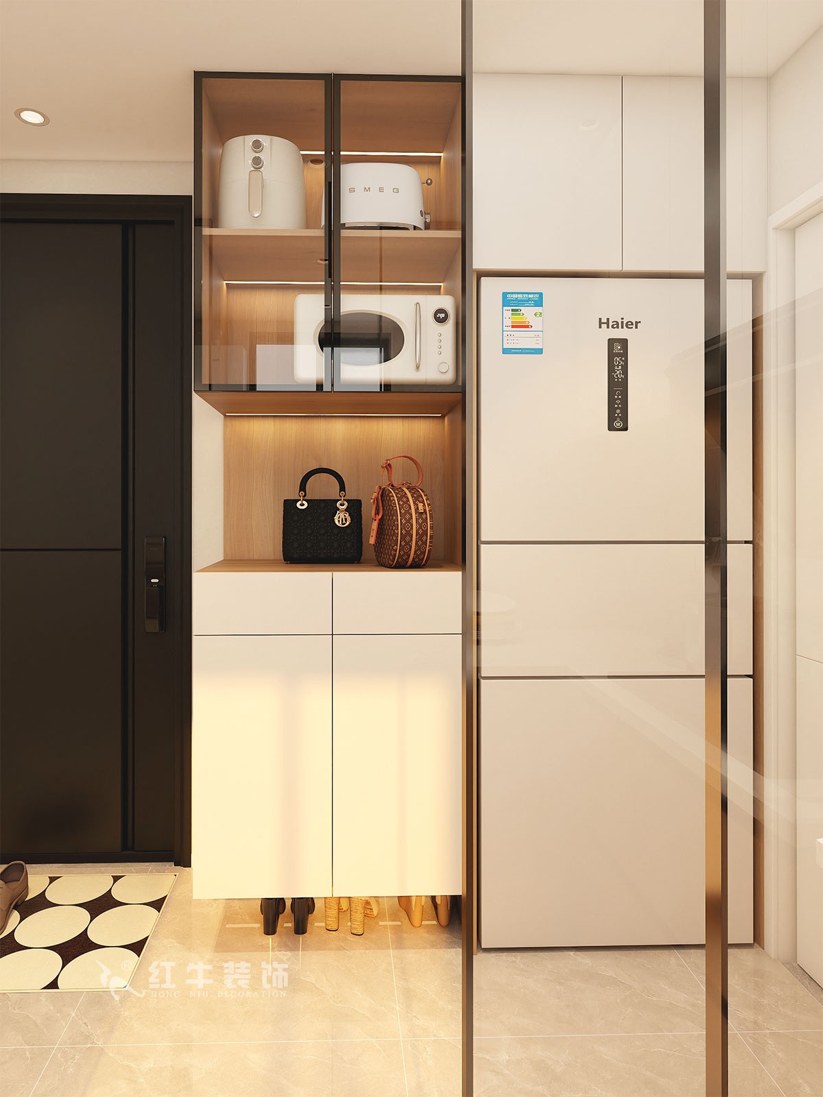 原戶型結(jié)構(gòu)客廳過小,廚房空間壓抑,與業(yè)主溝通后,改為開放式廚房,擴大入戶空間。