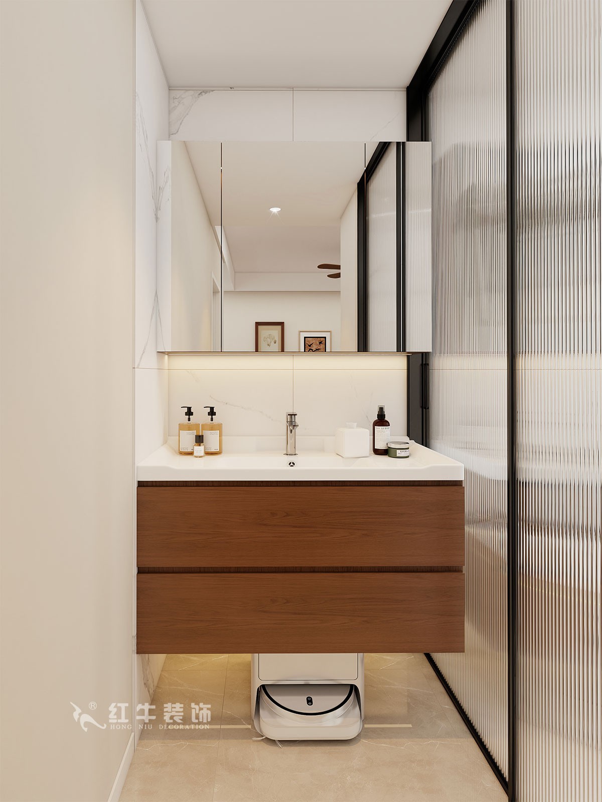 衛(wèi)生間說明:干區(qū)選擇整體色彩搭配干凈、大方,選擇大尺寸淺灰色瓷磚上墻,氛圍感溫馨感滿滿。