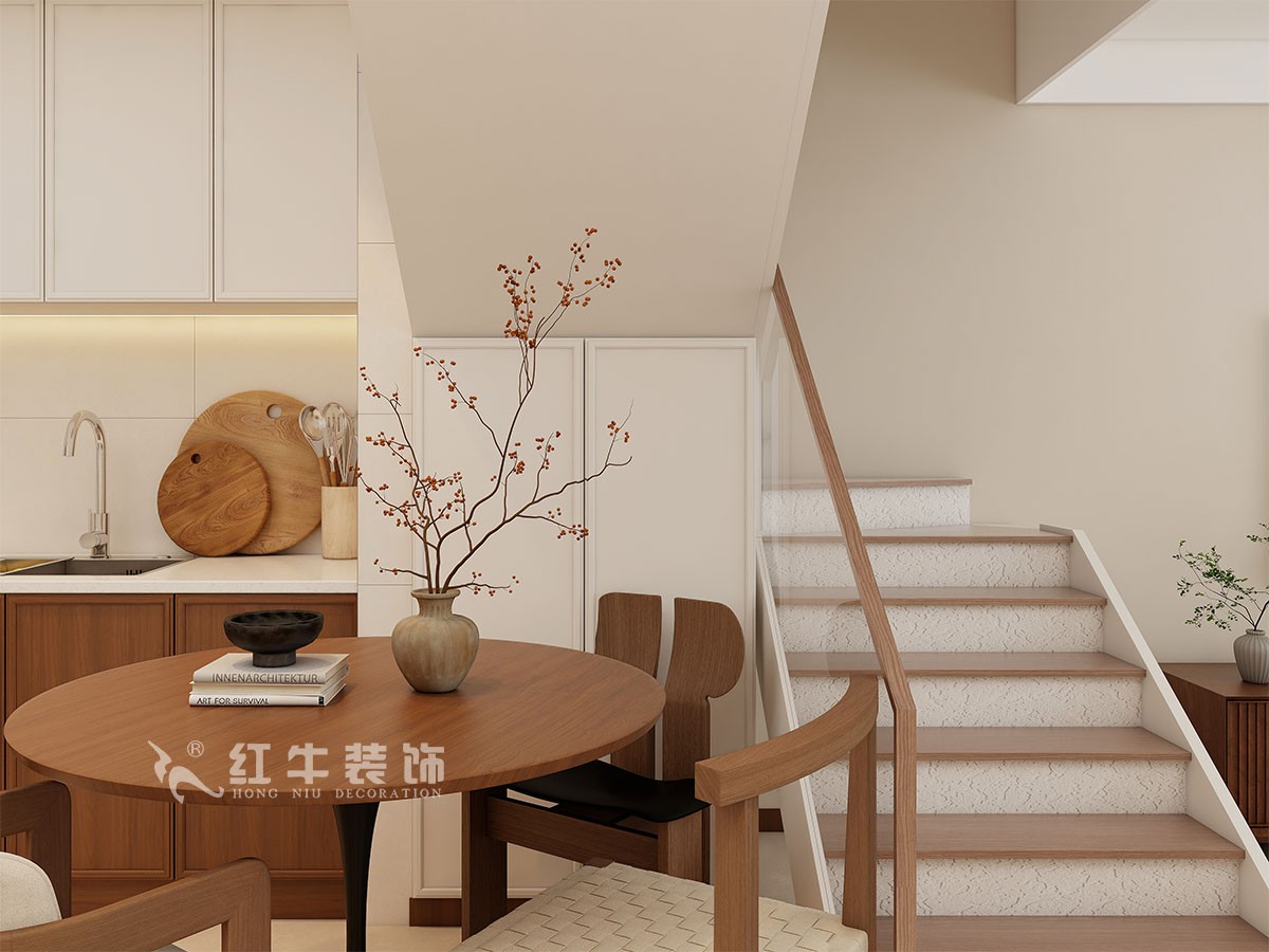 細(xì)節(jié)設(shè)計(jì):樓梯扶手與層板采用胡桃木色,串聯(lián)上下空間;軟裝以棉麻布藝為主,輔以少量金屬元素(如黑鋼燈具)提升精致感。綠植點(diǎn)綴增添生機(jī),強(qiáng)化自然氛圍。