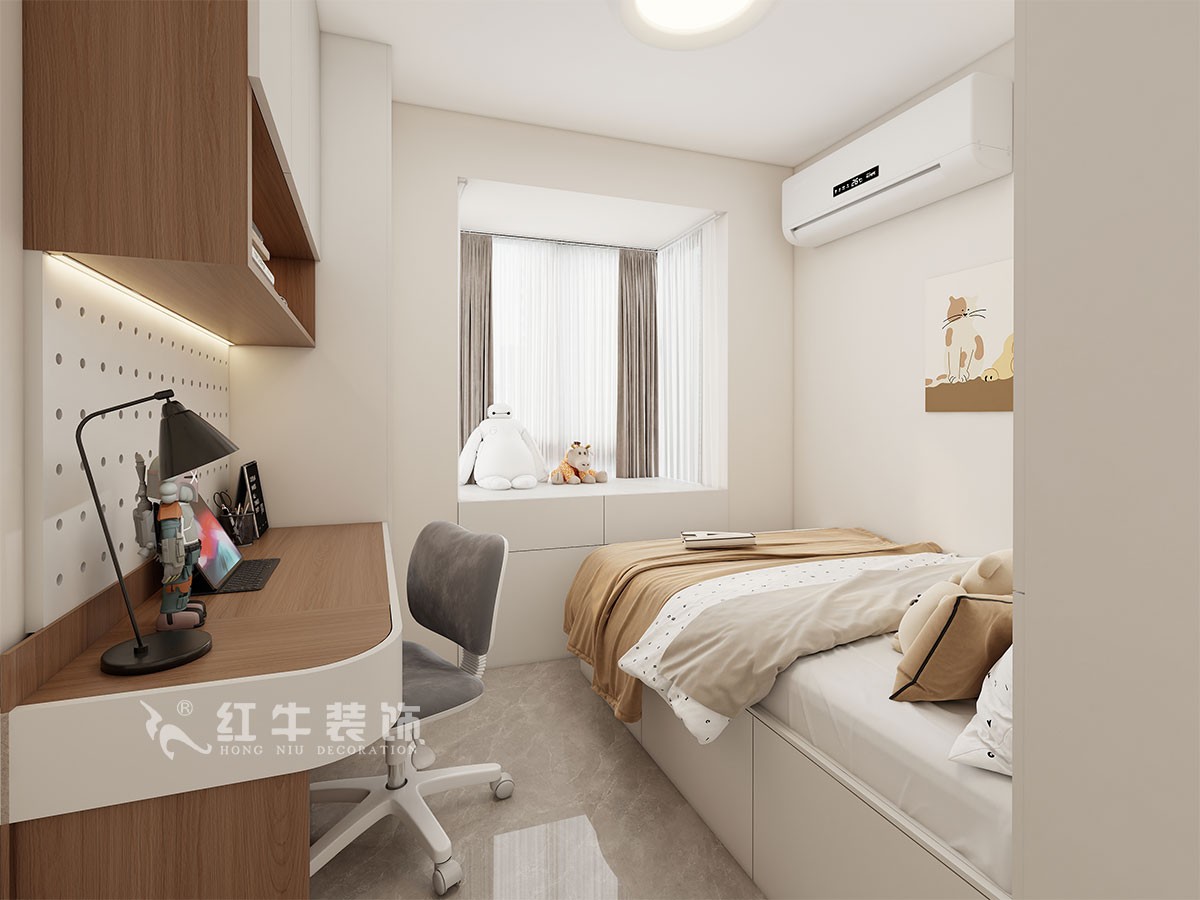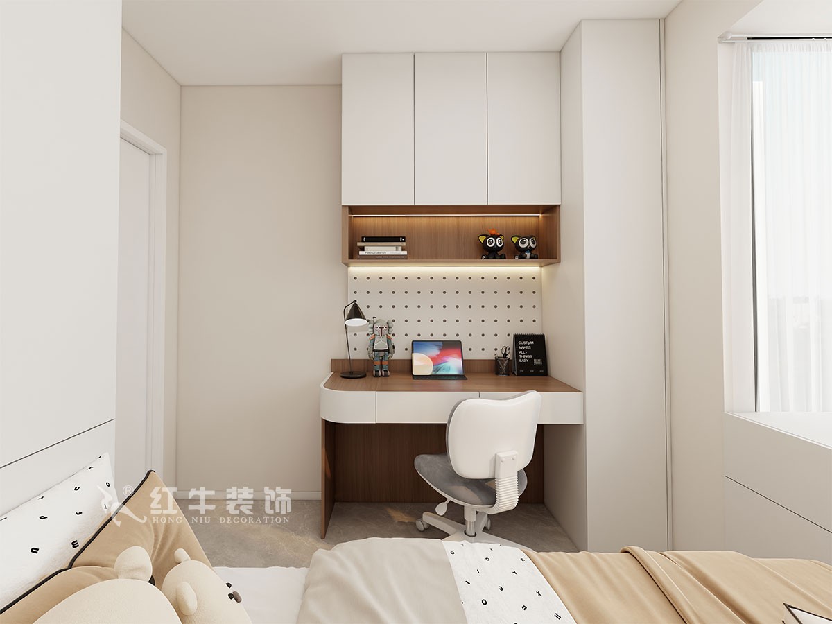 主要的設(shè)計在于兩個房間的規(guī)劃,房子的常住人員有兩個上學(xué)的孩子,需要兩個大的書桌,怎么在臥室規(guī)劃好書桌的利用是客戶比較在意的,其次是空間的收納既要美觀又要強大。
