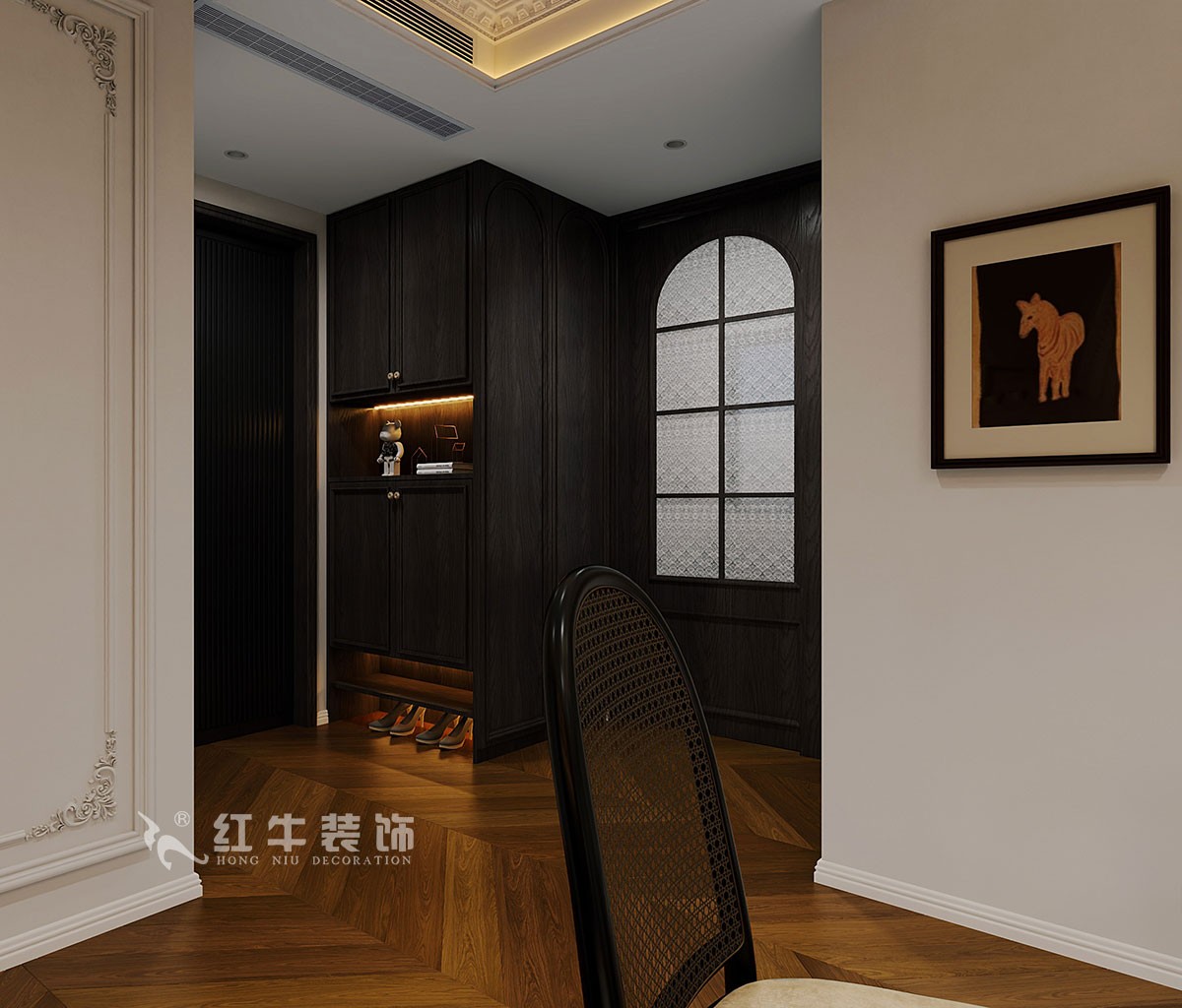 本案的設(shè)計(jì)定位為法式中古風(fēng)格??蛻?hù)一對(duì)夫妻帶二個(gè)小孩居住。原始戶(hù)型為四房?jī)尚l(wèi)比較方正,主衛(wèi)略小。跟客戶(hù)溝通擴(kuò)大了主衛(wèi)的空間,客衛(wèi)做干濕分區(qū),這樣更能滿(mǎn)足客戶(hù)的需求。生活陽(yáng)臺(tái)從保姆房進(jìn)出避免了保證小孩有個(gè)安靜獨(dú)立的空間整個(gè)空間寬敞明亮,居住更舒適。