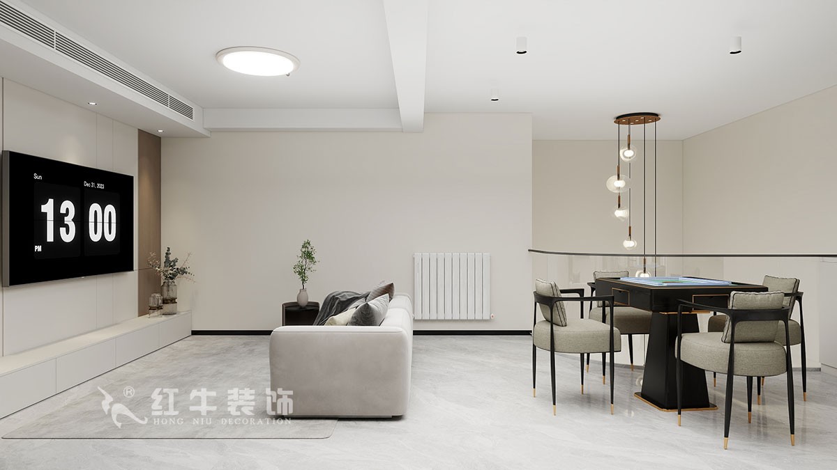 本案設(shè)計墻面用的是白色乳膠漆,讓空間更加溫馨,吊頂層高做高點,燈光設(shè)計講究空間的柔和,著重點光源的點綴,讓家更加明亮溫馨。