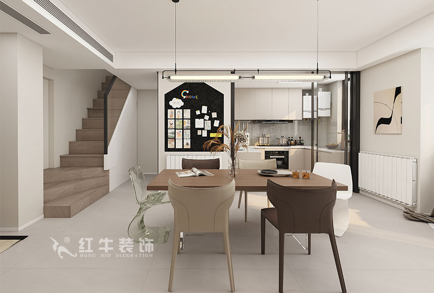 樓上下,通過溝通,一樓不保留衛(wèi)生間的功能,就把餐廚設(shè)計為一體,利用島臺的半墻做一個背景墻,完成空間的融合,沙發(fā)和柜子在一個面,整潔規(guī)整,增大空間感;二樓的書房設(shè)計開放式的,設(shè)計中用軟隔斷進(jìn)行分割。