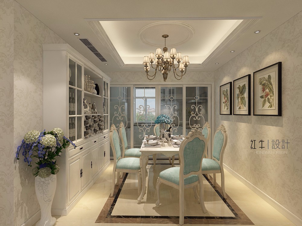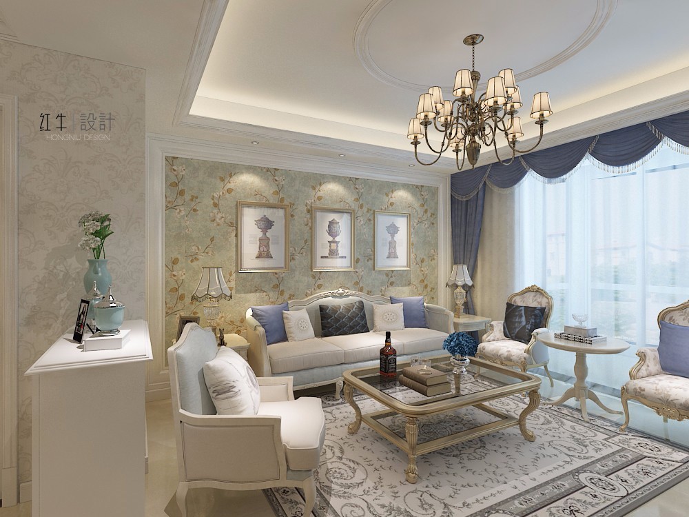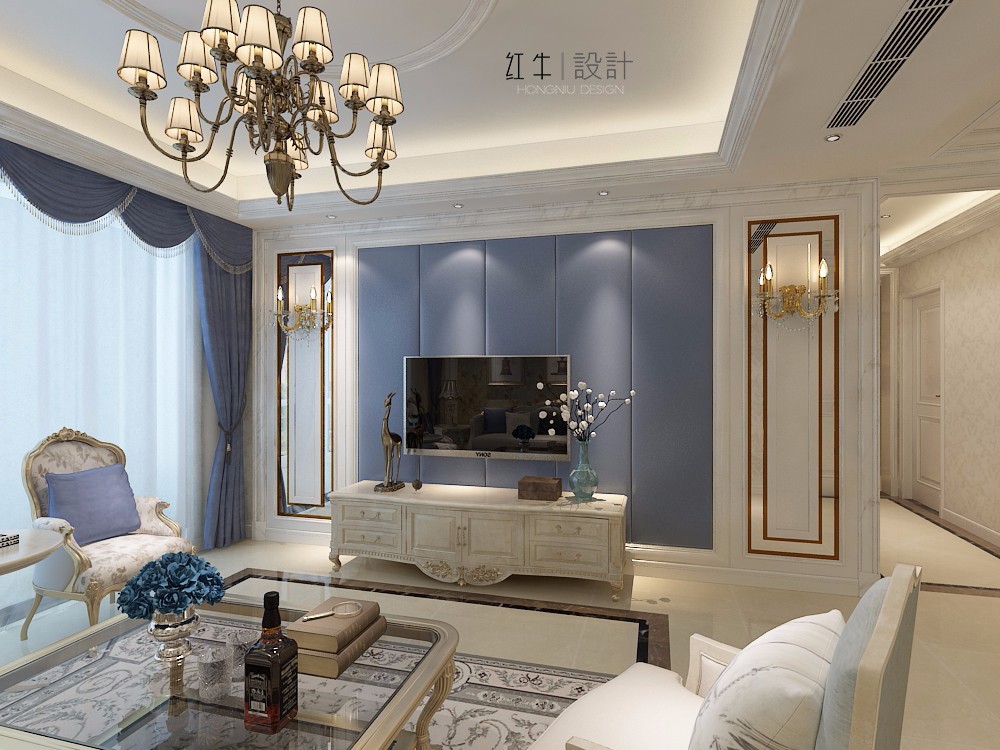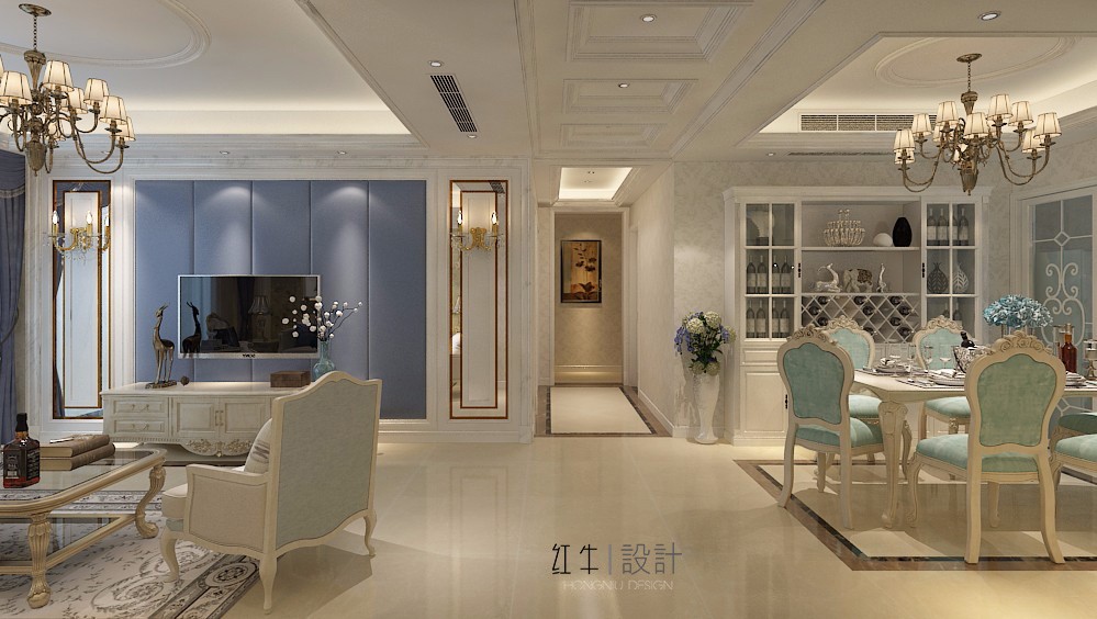 在設(shè)計的時候,居室色彩主調(diào)以白色,家具為古典彎腿式,部分家具和門為白色,采用嵌入式石膏吊頂和線條,搭配精致的水晶吊燈,營造出浪漫的感。以磚面作為地面裝飾材料,有很好的光澤感,在沙發(fā)區(qū)鋪上大幅花紋地毯,使空間區(qū)域劃分更加清晰。