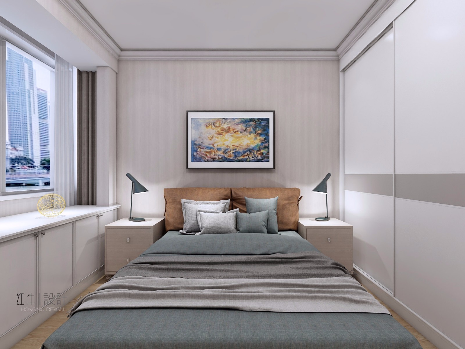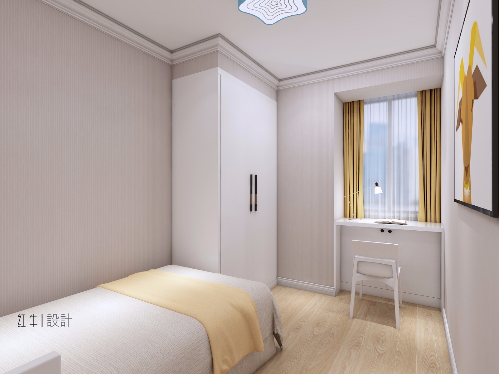 次臥以白色為主色調(diào),并選用淺色地板,使得整個空間顯得整潔明亮。