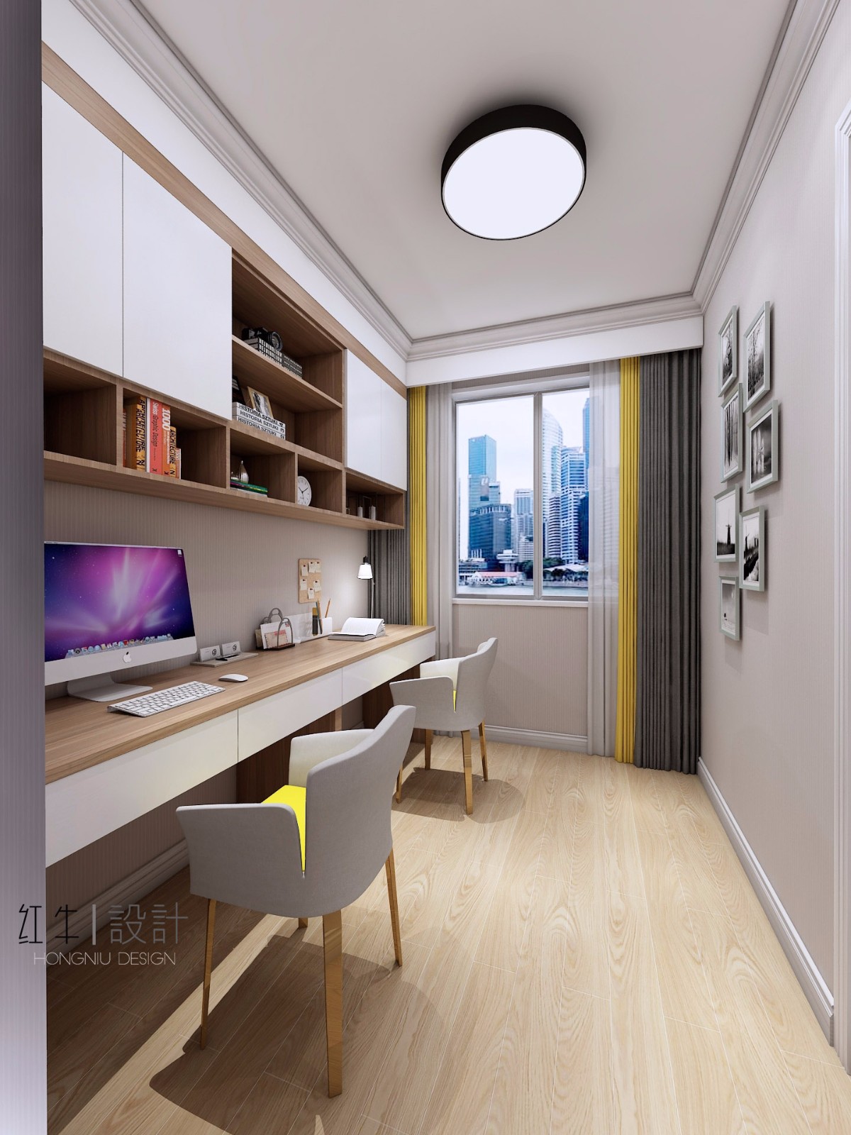 長書桌的存在,能容納兩個人同時使用,所以雖然書房面積不大,卻很實用。背后空白墻,掛上幾幅裝飾畫,層次變得豐富起來。