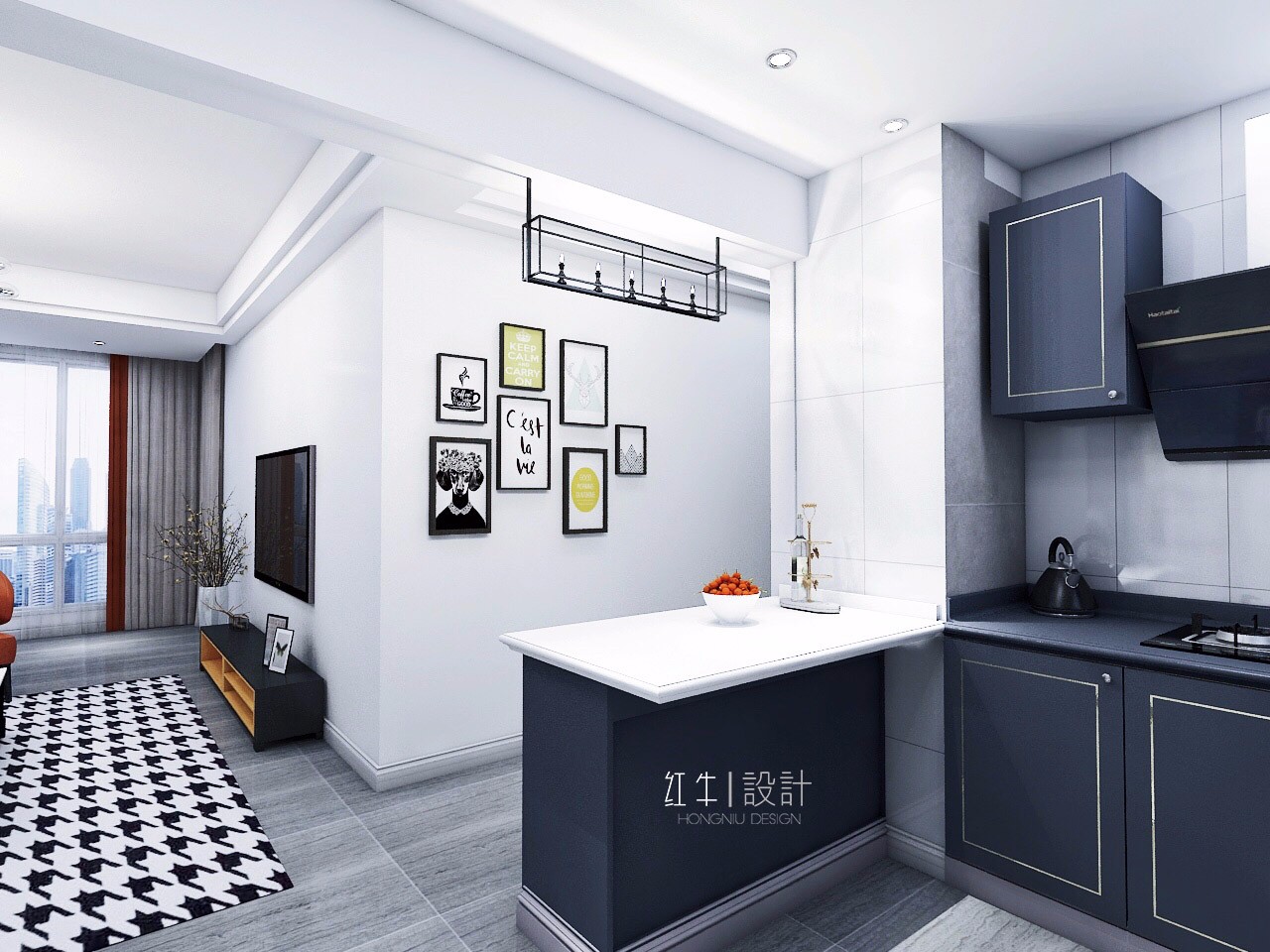 吧臺(tái)的一端與墻壁相連接,非常清晰的劃分出廚房的邊界。吧臺(tái)可以打造成一個(gè)小的餐桌,在這里喝一杯咖啡或者吃個(gè)簡餐都很不錯(cuò)。