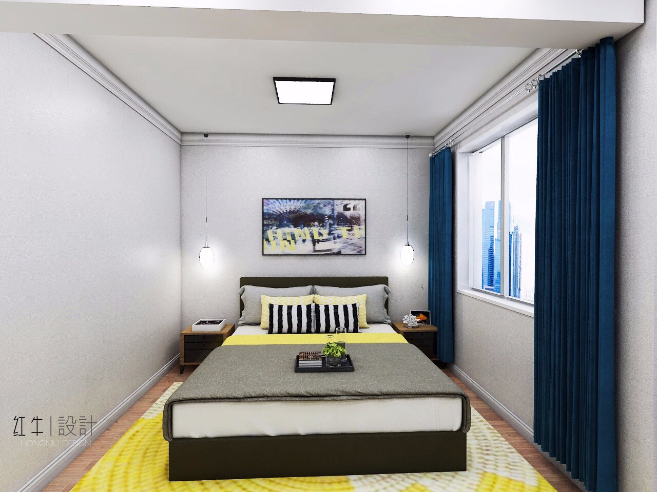 最后就是床的部分,床邊鋪上了軟軟的地毯,可以想象,光腳踩在上面,一定極為舒適。床頭安裝了兩盞吊燈,不僅能解放出桌面空間,還能提升了空間格調(diào)。背景墻上的裝飾畫彌補(bǔ)了墻面的空曠。