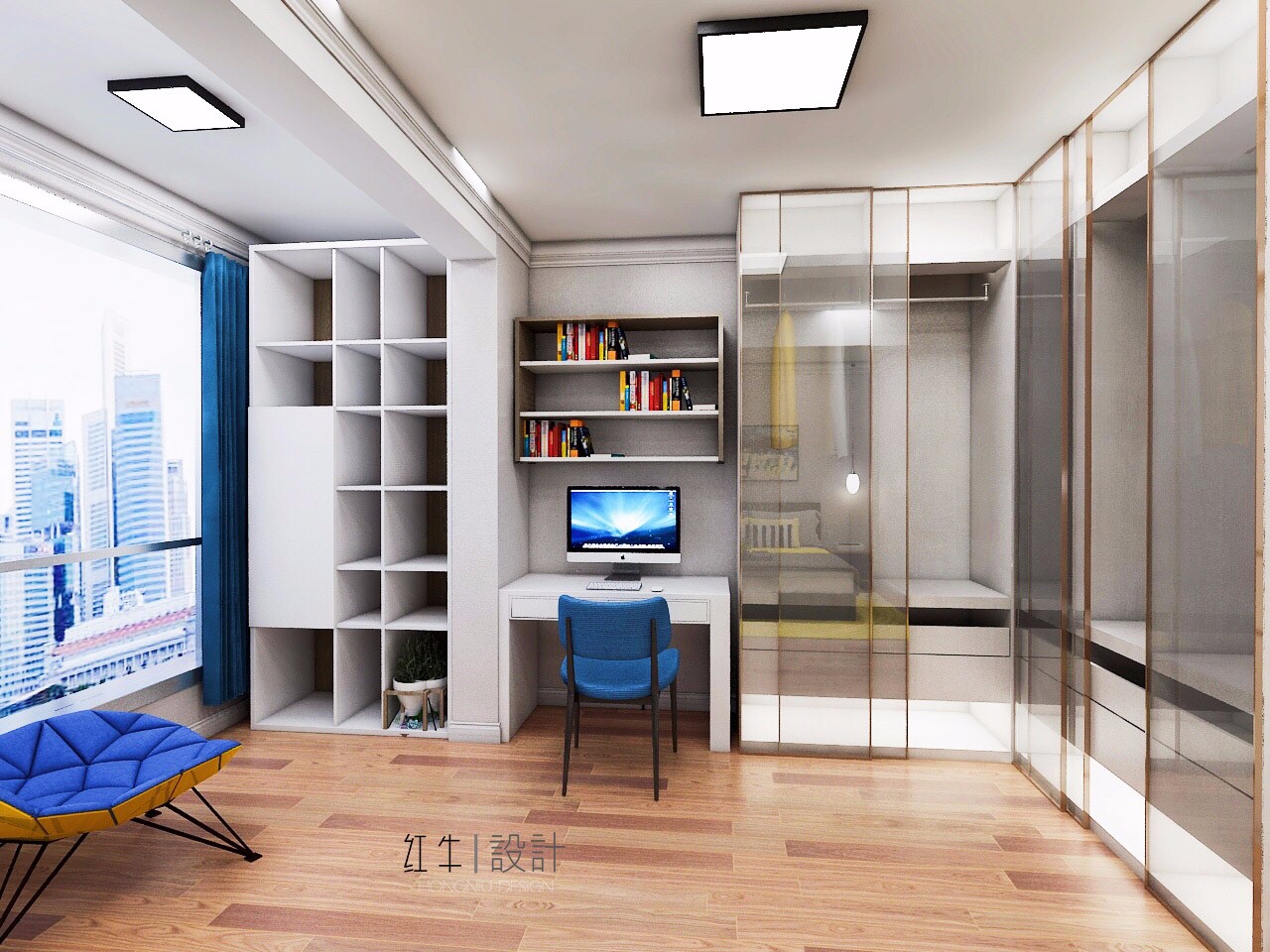 然后就是衣柜部分,柜門是有色玻璃,玻璃質(zhì)感通透,給人一種精致的感覺,效果很是驚艷。還留了一小塊地方放了張書桌,平時(shí)可以在此辦公。