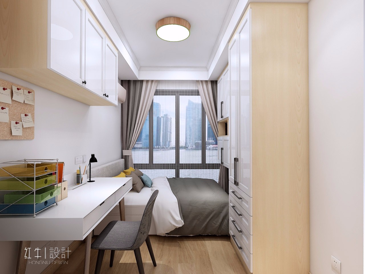次臥,雖然面積不大,利用率卻不小,到處是柜子。到頂衣柜下面有四個(gè)抽屜,是存放各種小物件的最佳場(chǎng)所。桌上、床前都是吊柜,中空部分可以放裝飾品。