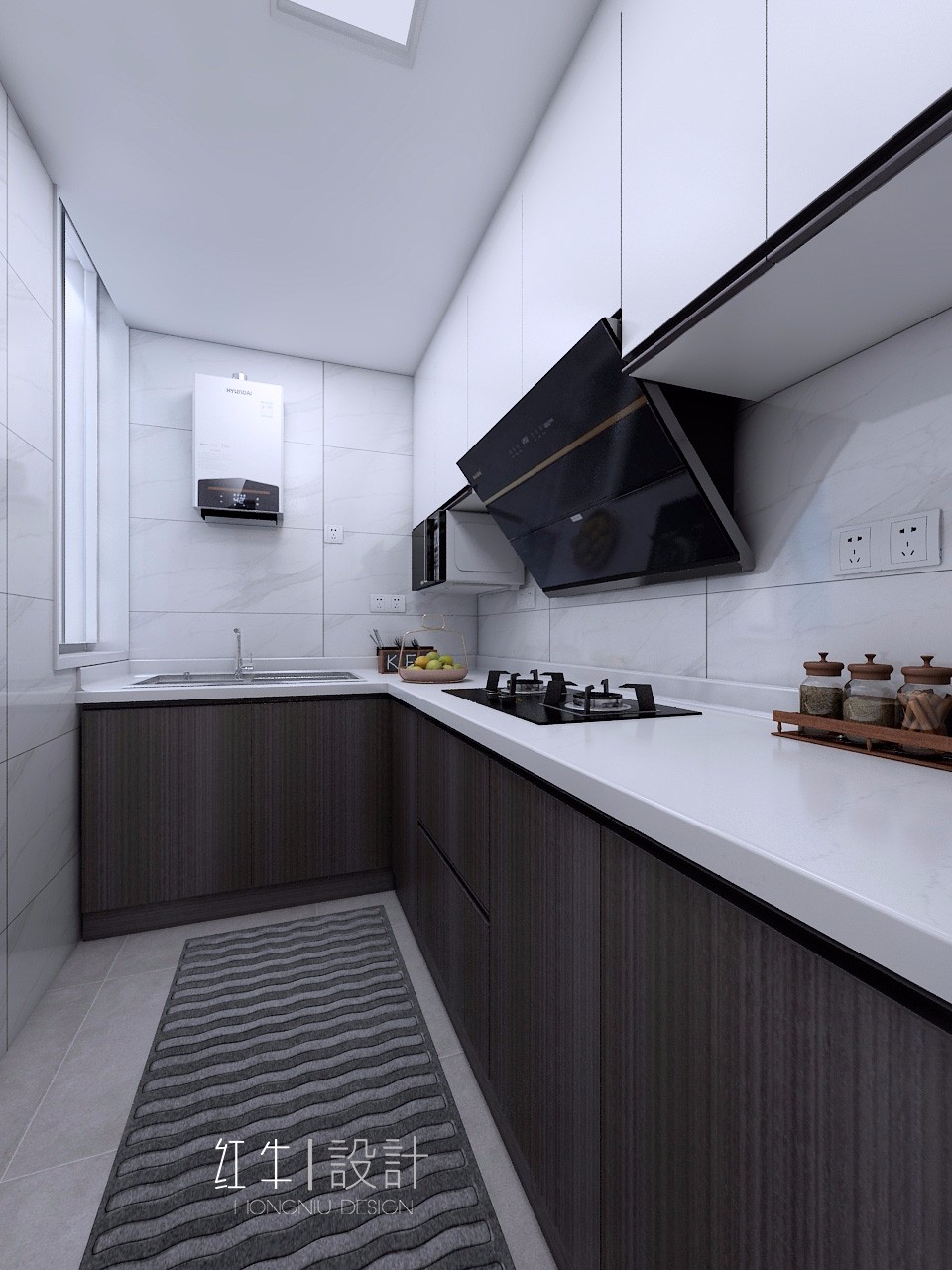 棕褐色的地柜與白色吊柜對(duì)比鮮明,體現(xiàn)了層次美。