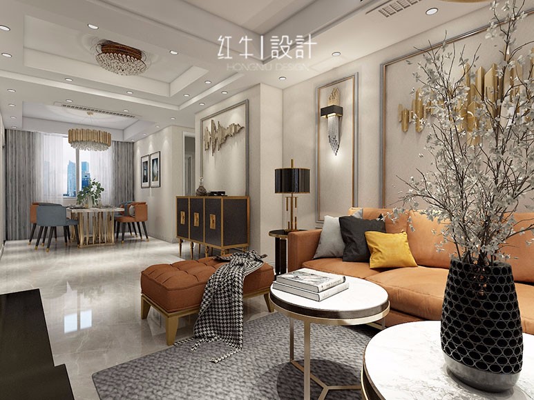 本案以陳設(shè)藝術(shù)品及金屬線條材質(zhì)來營(yíng)造大氣、自然、輕奢的鉆石美學(xué)氛圍。墻面、地面、家具陳設(shè)等均以簡(jiǎn)潔的造型、精細(xì)的工藝為其特征,強(qiáng)調(diào)品質(zhì)感和細(xì)節(jié)處理。在色彩搭配主要以暖色為主,溫馨的客桌花束、明亮的家具、直觀大氣的金屬材質(zhì),帶著淡淡的隨意,隨著輕輕的希翼讓人感受到的是空間彌漫的溫馨與舒暢。