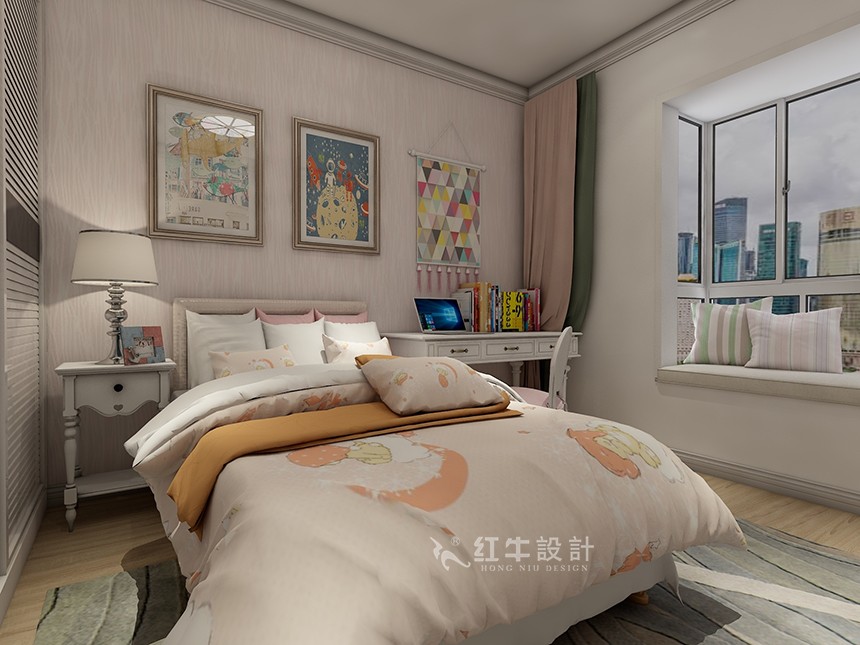粉色的墻面,搭配充滿活力的裝飾畫,淡雅清新的床品,給人一種溫暖舒適的感受,是兒童房這個(gè)空間該有的詮釋。