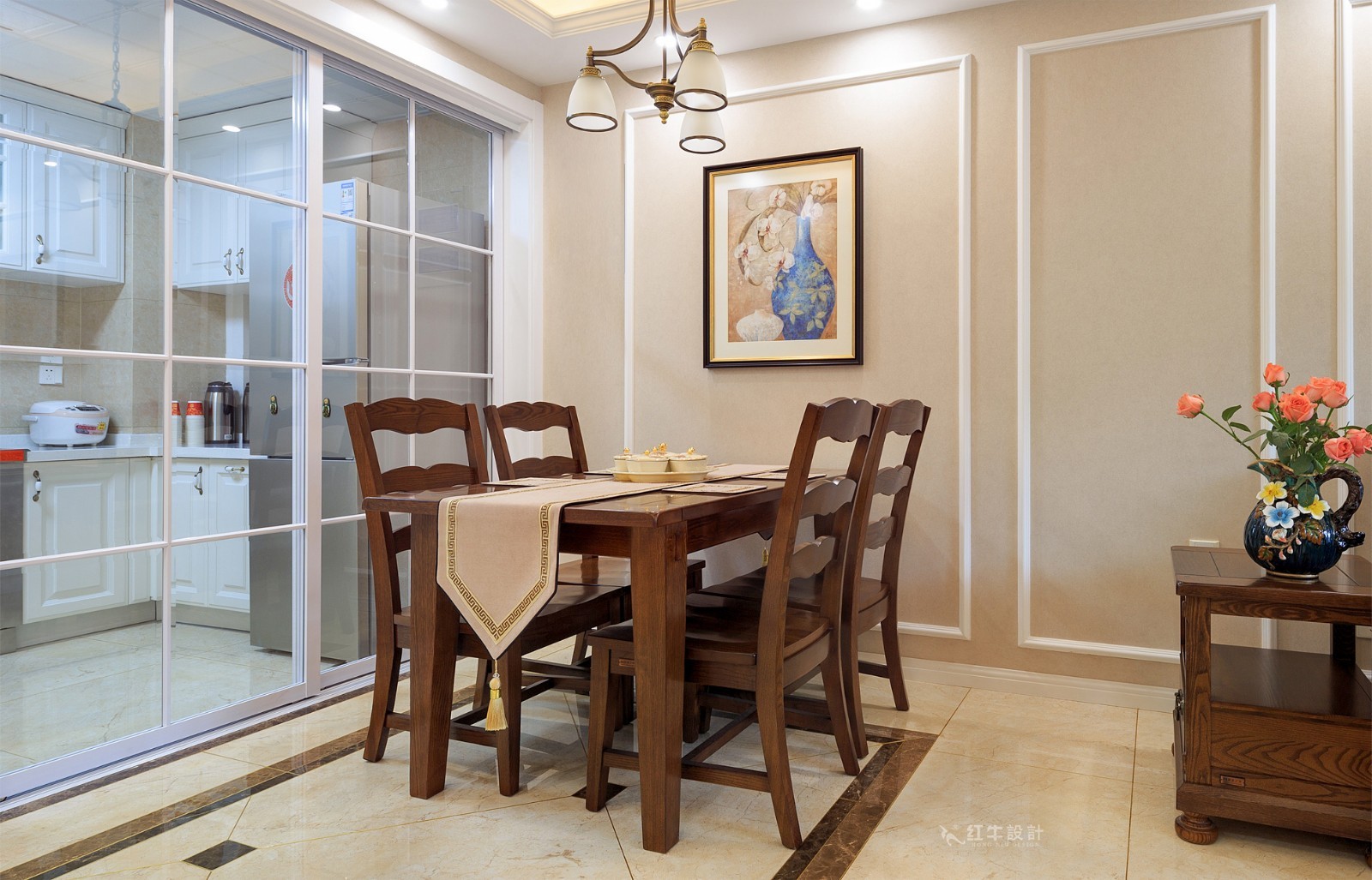簡潔大方的餐廳,桌上鋪著色彩協(xié)調(diào)的桌旗,墻上掛著古典氣質(zhì)的裝飾畫,起到了提升格調(diào)的作用。