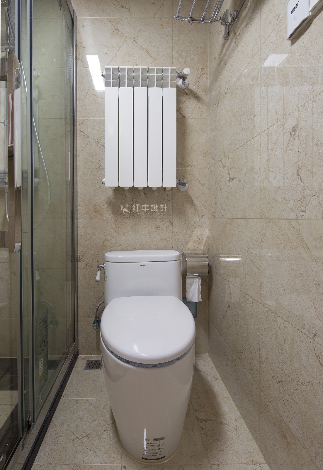 洗手臺被分離在外,提高了衛(wèi)生間的使用效率。衛(wèi)浴部分非常簡潔,以實用和功能性為主。