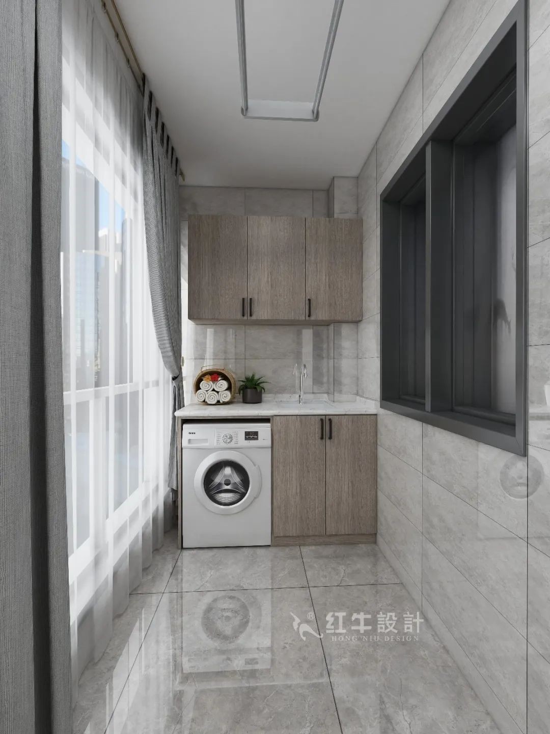 這里由原先的兩個小陽臺打通而成,實用性很強(qiáng),包含了洗衣、晾曬、收納等諸多功能。