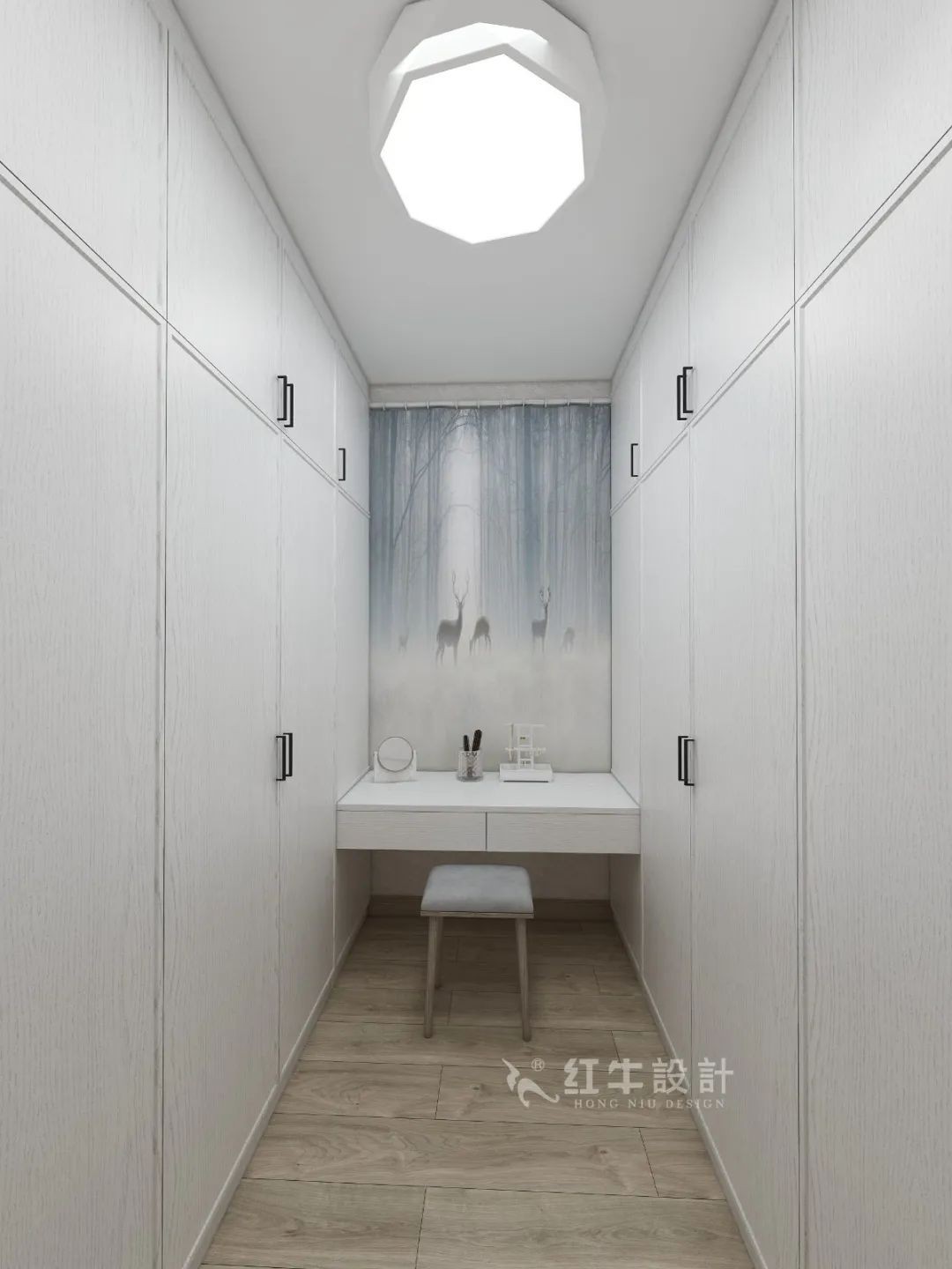 書房旁邊是衣帽間,定制純白衣櫥、化妝臺,搭配木質(zhì)地板,顯得清新自然。化妝、更換衣服全部能在這個房間里面搞定。