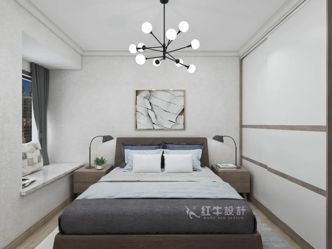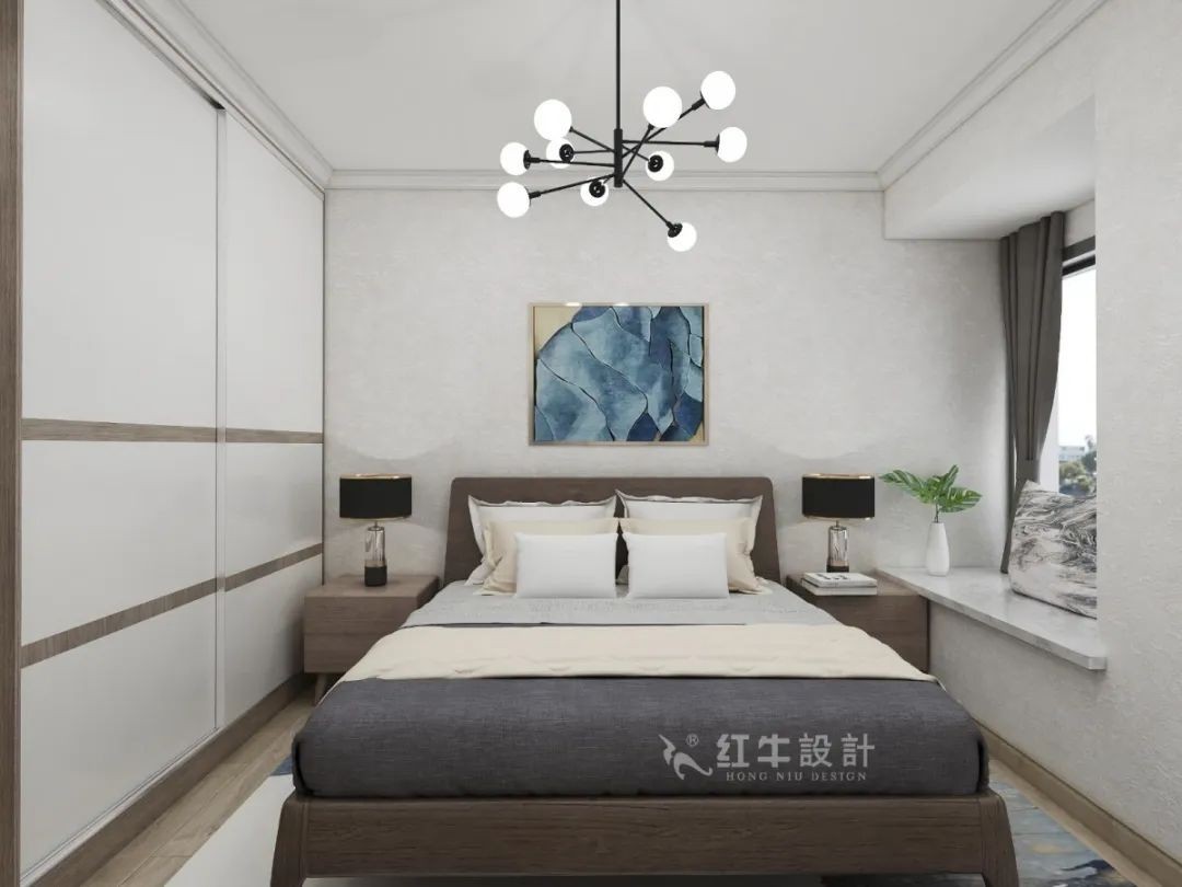 臥室呈現(xiàn)對稱性,床的兩側(cè)保持平衡。選用推拉門衣柜,不占空間,還給人一種簡潔明快的感覺。