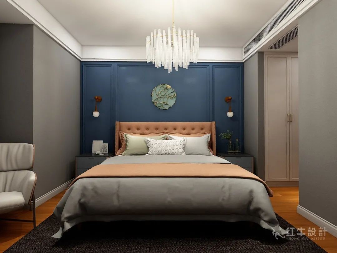 臥室色調(diào)呼應(yīng)客廳,橘色的床凸顯了臥室空間是以床為主體,金屬的壁燈與吊燈的呼應(yīng),使空間更加時(shí)尚。