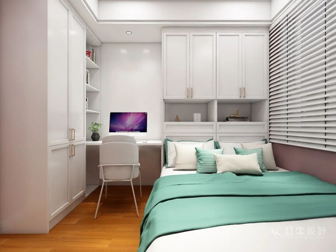 主臥相對(duì)進(jìn)深比較長(zhǎng),可以適當(dāng)分割成兩個(gè)空間,拿出一部分設(shè)計(jì)成半開放式儲(chǔ)物間,增加衣物收納空間,又避免主臥衛(wèi)生間的濁氣直接對(duì)著床。