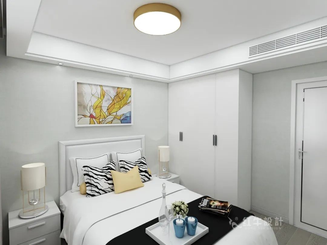 次臥室朝北,采光上沒有南邊臥室好,實(shí)用采用灰白色的墻布與純白色的床體,使得視覺上顯得更加輕盈。再通過明亮的掛畫以及金色吸頂燈,讓空間不顯單調(diào)。
