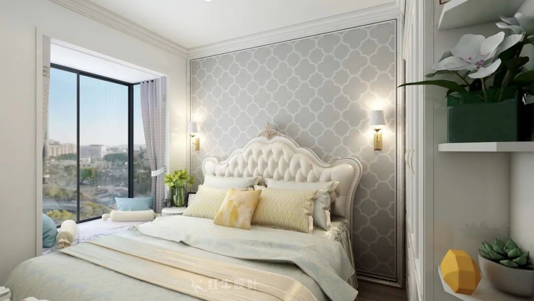 主臥考慮到是給長(zhǎng)輩居住,在色調(diào)跟款式上略顯穩(wěn)重,灰色格紋的墻紙跟歐式的床形成鮮明的對(duì)比。