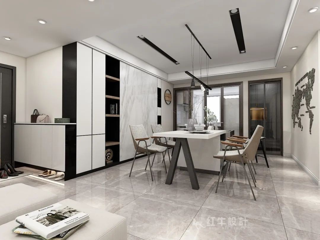 入口的門廳處設(shè)計了薄款半截懸空式鞋柜,懸空處可以放置日常的拖鞋。鞋柜柜體延伸至餐廳裝修柜,強化了空間的統(tǒng)一性和整體性。