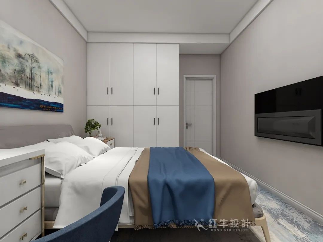 北面房間面積較小,采光通風(fēng)也不理想,還與客衛(wèi)相通,顯然不可取,為了使其具備臥室的空間面積,可以把北陽臺并入,整體設(shè)計成一間能夠滿足業(yè)主需求的、功能齊全的臥室來。