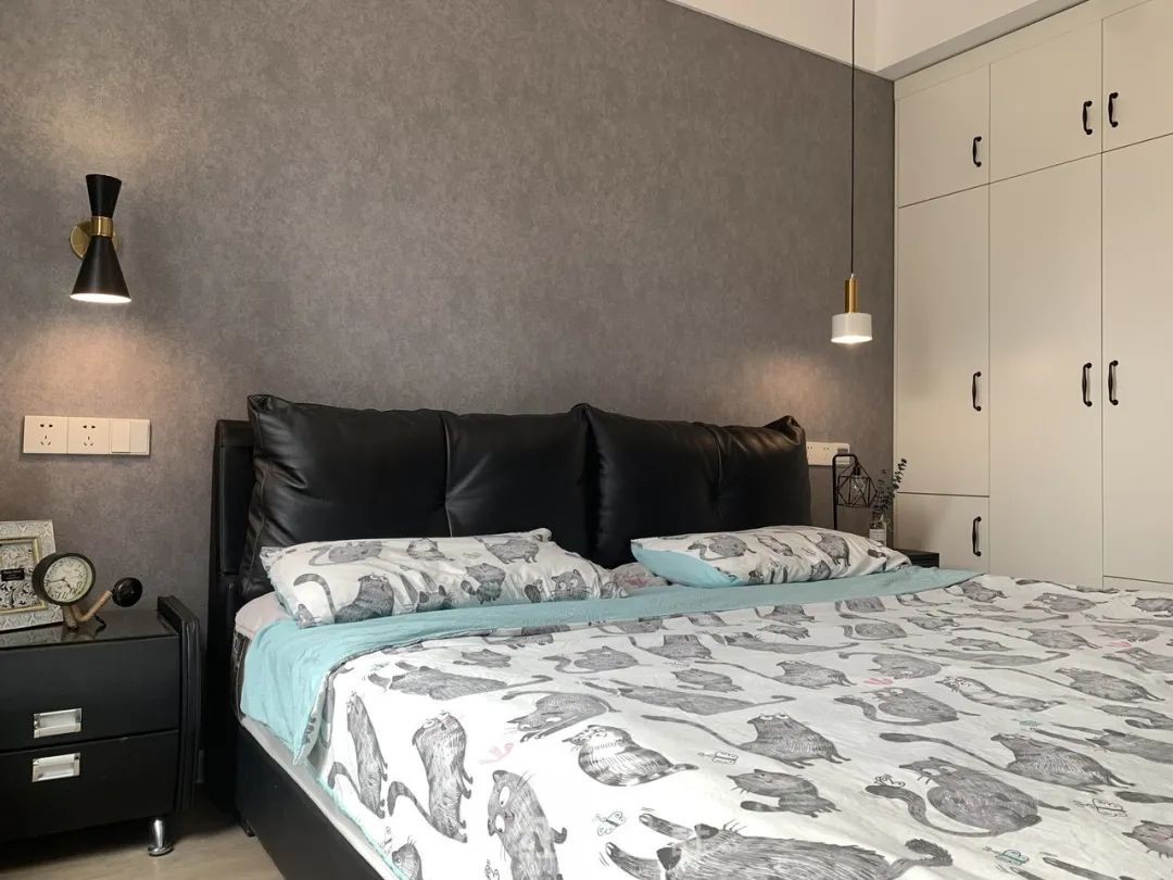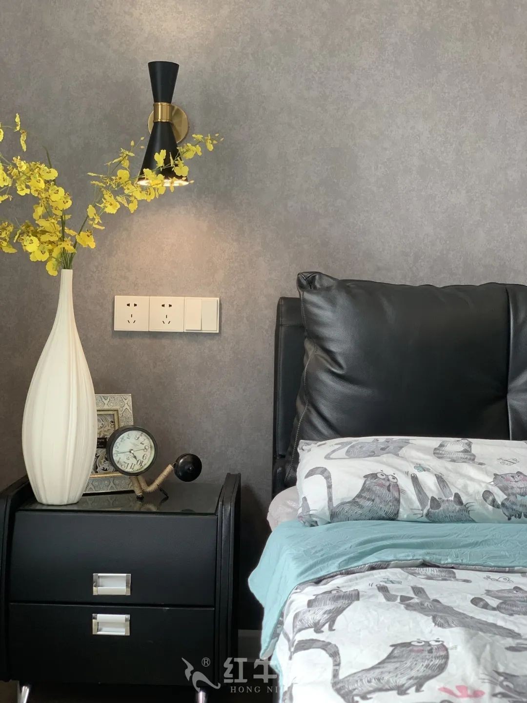 灰色背景下的黑色床品,看起來頗有時尚感。床頭兩側(cè)不同類型的燈具對比,增加空間靈動性,營造出別致優(yōu)雅的燈光環(huán)境。