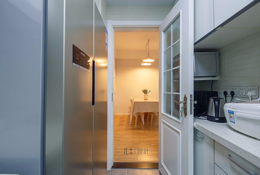 2.由于廚房的開間比較小,只夠做一個(gè)L型的柜子,再加上要放雙門冰箱,廚柜操作臺面特別小,所以把衛(wèi)生間和廚房的中間墻體拆掉,縮小的衛(wèi)生間的開間,擴(kuò)大了廚房的空間,增出了很多臺面。