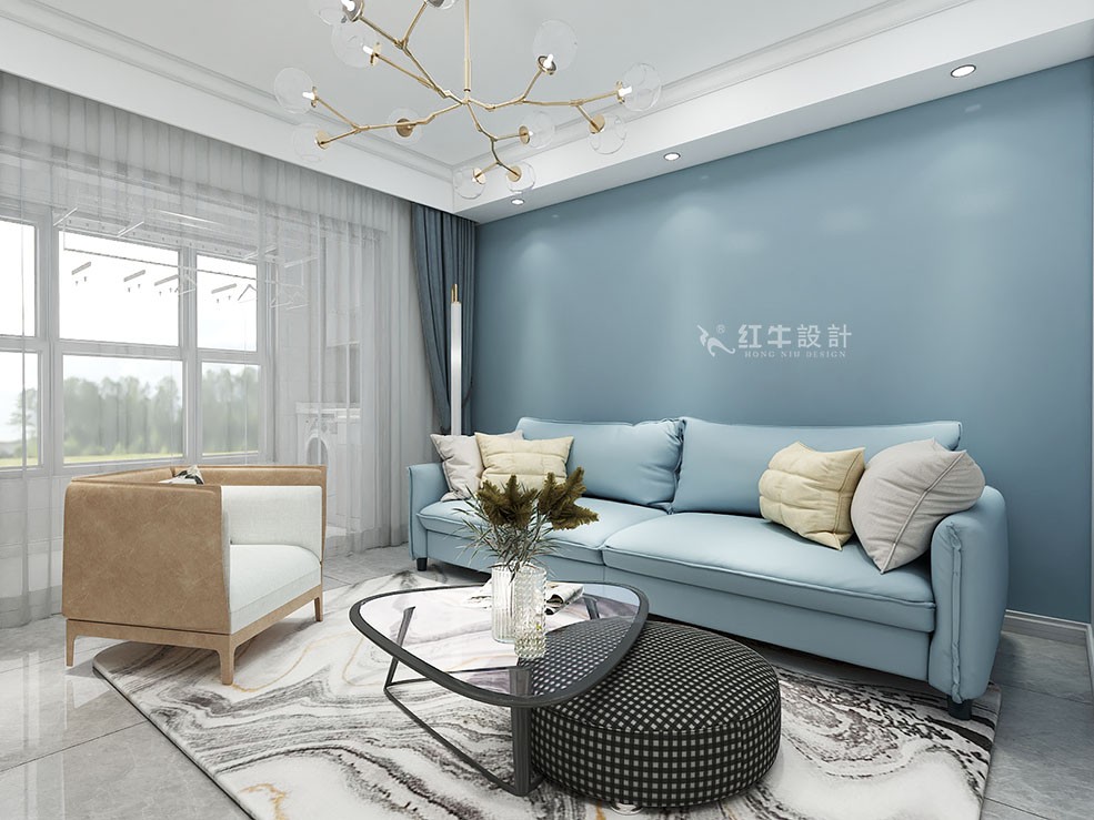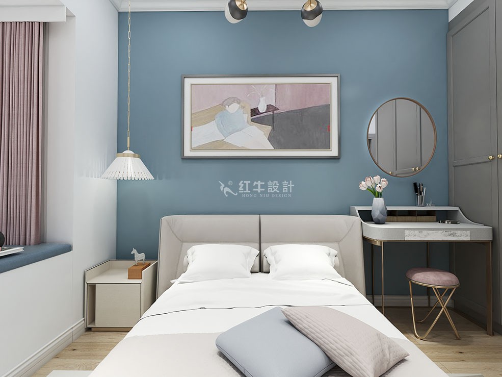 本案以輕松愉悅的北歐風設(shè)計感與溫馨家的氛圍為出發(fā)點,公共區(qū)域客廳用霧霾藍背景墻,與其他區(qū)域形成鮮明對比,著重空間視覺重點。私密區(qū)域,次臥增加梳妝臺,床頭一側(cè)的小吊燈,不對稱的設(shè)計,不拘一格。兒童房榻榻米,與淡黃色的乳膠漆,顯得空間童趣又具有足夠的儲藏空間。整體營造北歐風與溫馨家的氛圍。