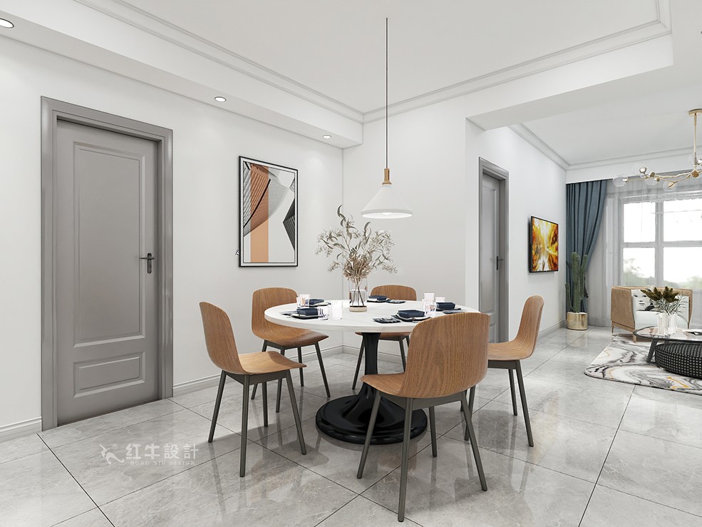 圓形餐桌互動性很強,家人圍桌而坐,顯得更加親密??筒蛷d選擇的灰色瓷磚,無論是耐磨還是易清潔方面,都符合大多數(shù)業(yè)主的追求。