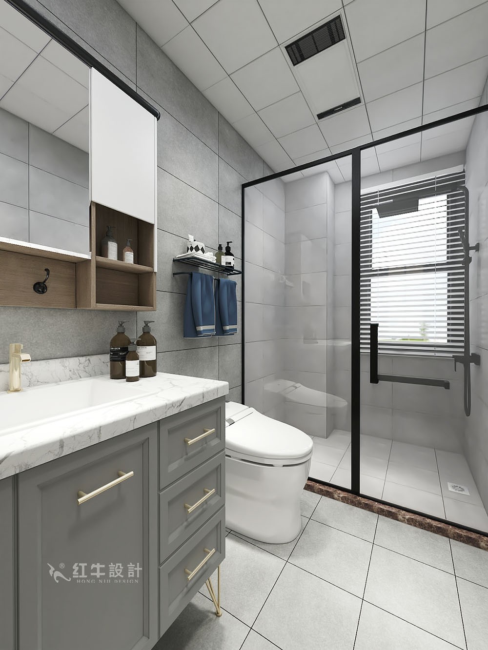 洗手臺沒有到底,能夠減少水汽對它的腐蝕,此外還方便打掃。入墻式馬桶非常簡潔,顏值頗高。鏡柜既是鏡子,又能用來收納,使得衛(wèi)生間的物品井井有條。
