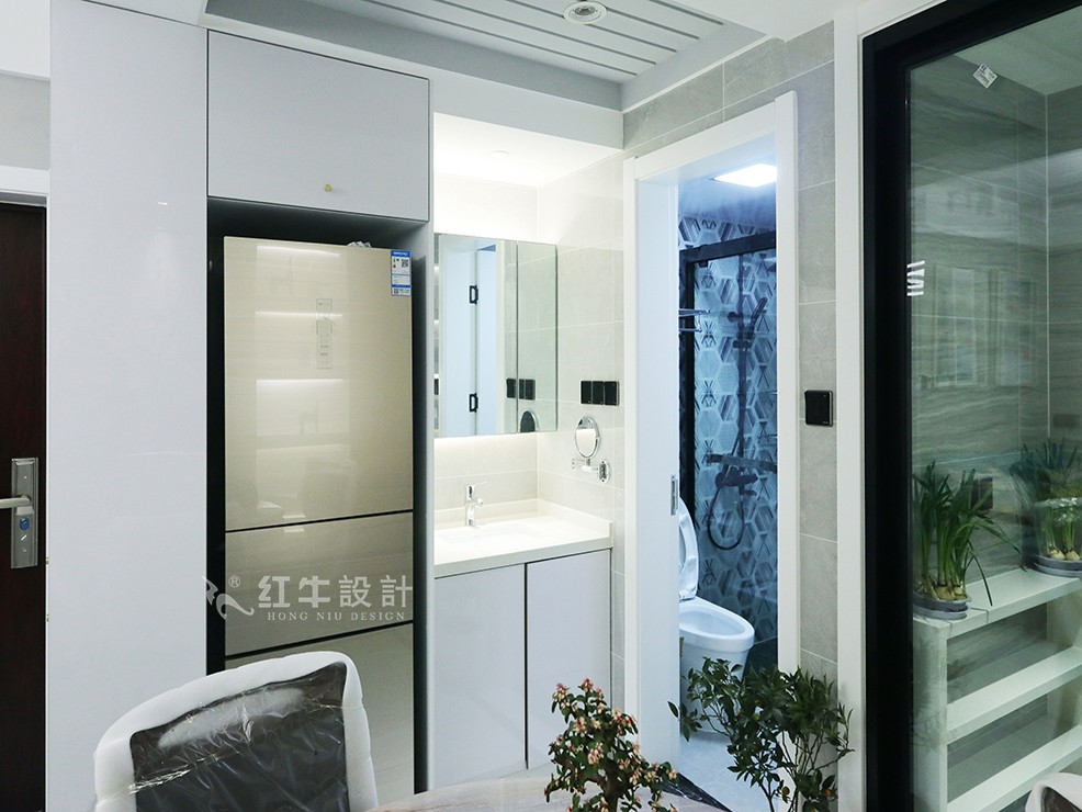 進(jìn)門左手邊,玄關(guān)柜、冰箱、洗手臺依次排開,甚至于冰箱上面設(shè)計了頂柜,洗手臺的鏡子部分用鏡柜來代替,使得空間利用最大化。